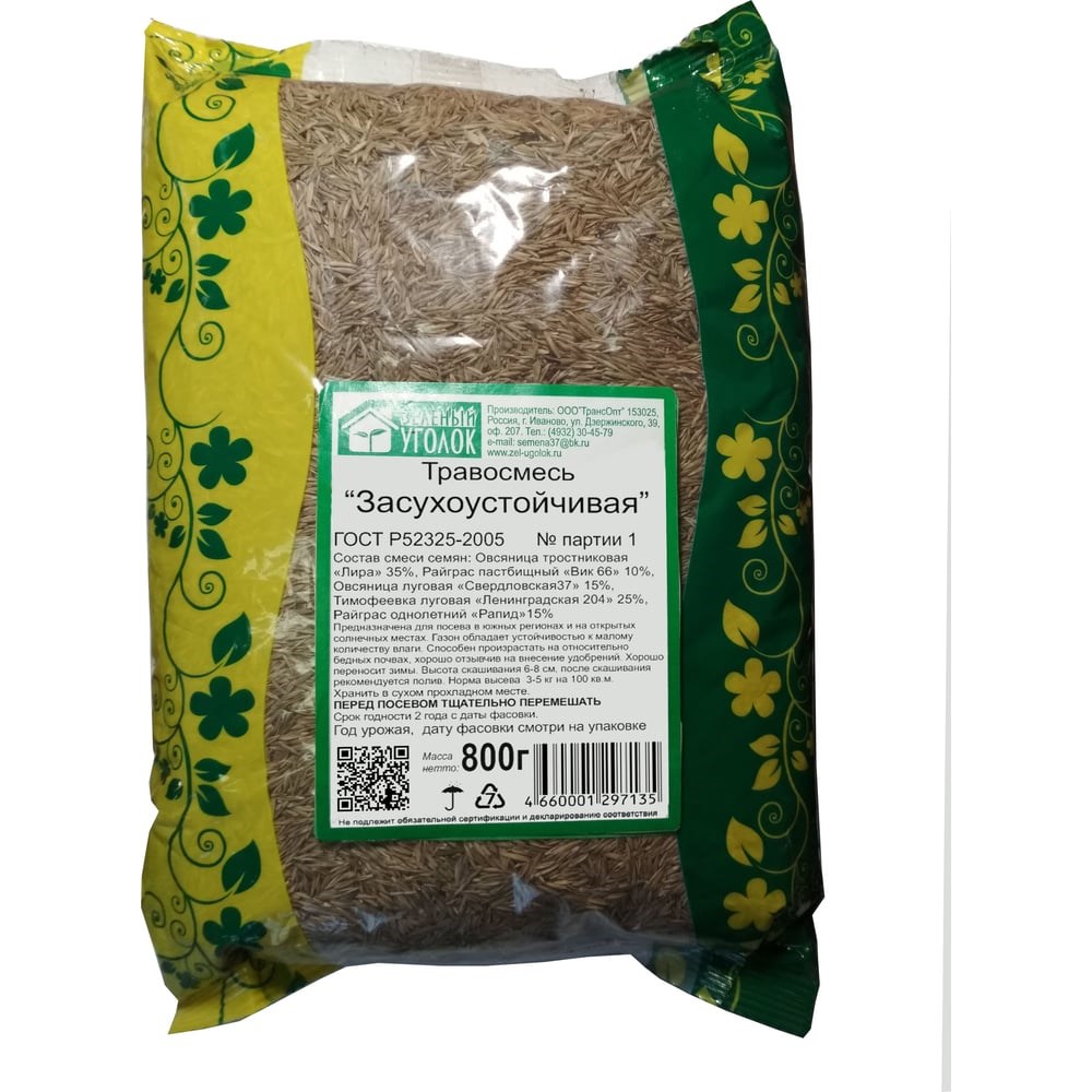 Семена газона Зеленый уголок Травосмесь Засухоустойчивая 0.8 кг 22629 предназначены для посева в южных регионах с жарким продолжительным летом, а также на открытых солнечных местах. Газон из данной смеси семян обладает устойчивостью к малому количеству влаги, временной засухе и нерегулярному поливу. Способен произрастать на относительно бедных почвах, однако хорошо отзывчив на внесение удобрений. Также газон из засухоустойчивой травосмеси хорошо переносит зимы. Высота скашивания 6-8 см, после скашивания рекомендуется полив.