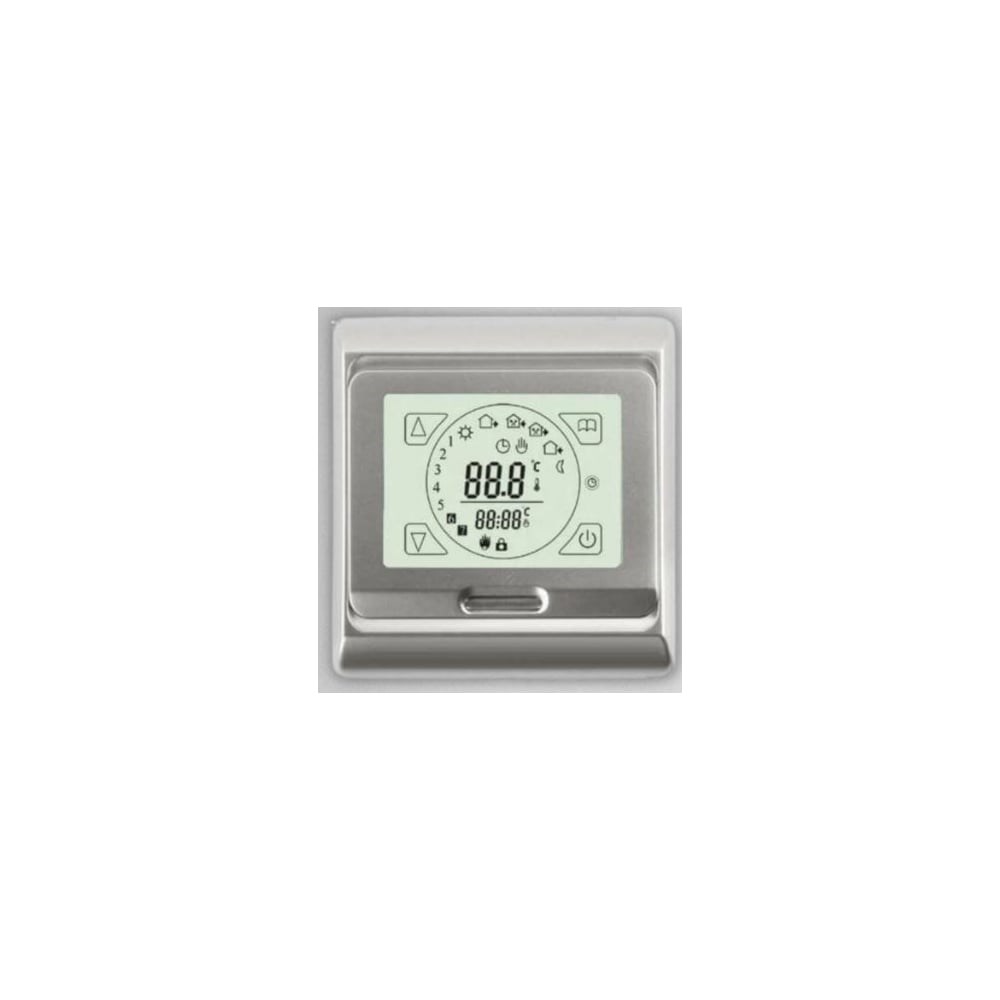 Терморегулятор для тёплого пола ТеплоСофт сенсорный E91.716 серебряный 91716/серебряный для управления тёплыми полами (нагревательный мат, инфракрасная пленка, кабельные секции) и отопительными приборами. Терморегулятор E 91.716 имеет большой информативный жидкокристаллический экран с синей подсветкой на который выводится вся нужная информация. Три режима работы: ручной, программируемый и комфортный, позволяют поддерживать температуру тёплого пола с различной температурой в различные промежутки времени суток и обеспечивают до 40% экономии электроэнергии.