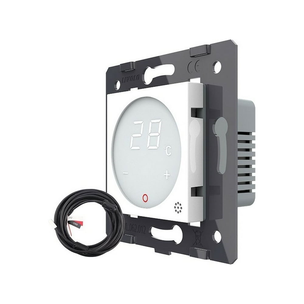 Сенсорный терморегулятор пола LIVOLO с внешним датчиком, белый (механизм) VL-FCQ1-2WPS72 вписывается в любую комнату, дополняя дизайн интерьера. Цифровая индикация температуры делает настройку наглядной и точной. Терморегулятор имеет встроенный датчик температуры воздуха, а в комплект дополнительно входит внешний датчик температуры пола длиной 5 метров модель VL-XQ001. При подключении внешнего датчика пола, встроенный датчик температуры воздуха отключается. Эксплуатация В выключенном состоянии кнопка вкл/выкл горит синим цветом. При включении терморегулятора кнопка вкл/выкл горит красным цветом, отображаются кнопки «+» и «-» регулировки температуры и текущая температура, переданная датчиком. При касании кнопки «+» или «-» регулировки температуры показывается заданная температура. При каждом коротком нажатии на кнопку установка температуры изменяется на 1 градус. При нажатии в течение 3 секунд установка температуры изменяется с шагом 2 градуса. Диапазон установки температуры от 5 до 35 градусов. Терморегулятор поддерживает установку и измерение температуры в градусах Цельсия и Фаренгейта. Для переключения между системами измерения, необходимо одновременно нажать и удерживать кнопки «+» и «-» более 3 секунд. Если кнопки регулировки температуры не нажимать в течение 5 секунд, на дисплее будет отображаться температура, измеренная датчиком. При отключении питания терморегулятора настройки сохраняются. Рамка в комплект не входит.