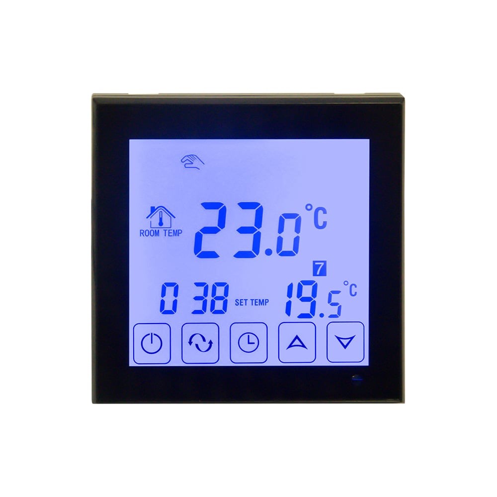 Терморегулятор Rexant сенсорный с автоматическим программированием R200B черный 51-0574 подключается к системе отопления серии R200. На регуляторе устанавливается необходимая для помещения температура, регулятор сравнивает ее с реальной температурой и в зависимости от этого включает или выключает систему отопления. Это значительно экономит энергоресурсы. Все настройки устанавливаются на интуитивно понятном сенсорном дисплее. Программное управление дает возможность устанавливать 6 недельных программ, а также есть ручной режим.