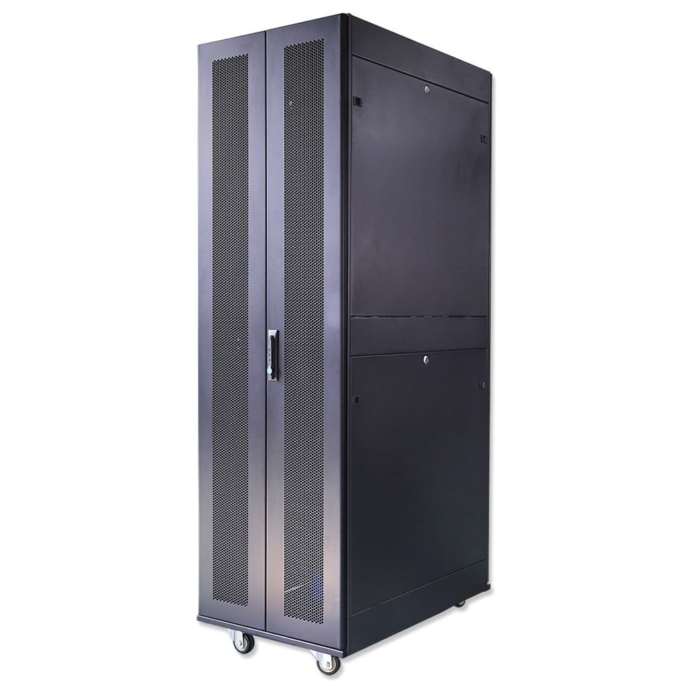 Шкаф серверный телекоммуникационный предназначен для размещения телекоммуникационного, электротехнического, кроссового и иного оборудования стандарта 19 дюймов (19”), в соответствии с ГОСТ 28601.2(МЭК 297-2). Каркас шкафа состоит из двух сварных рам соединенных между собой горизонтальными поперечными профилями. За счет такой конструкции распределенная нагрузка может достигать 1500 кг. Шкаф комплектуется передними и задними двустворчатыми дверями с ригельным замком и съемными боковыми панелями. Передние и задние двери металлические с перфорацией. Доступ в шкаф для монтажа и обслуживания возможен с четырех сторон, для ввода кабелей предусмотрены кабельные вводы в крыше и в основании. 4 вертикальных монтажных профиля имеют юнитовую маркировку и регулируются по глубине. В основание шкафа предусмотрена установка винтовых опор (ножек) позволяющих компенсировать неровности пола, так же возможна установка шкафа на роликовые опоры. Шкаф выполнен в климатическом исполнении УХЛ4.2 по ГОСТ 15150-69 и предназначен для эксплуатации в закрытых помещениях. Степень защиты шкафа соответствует IP 20. Поставляется в разобранном виде.