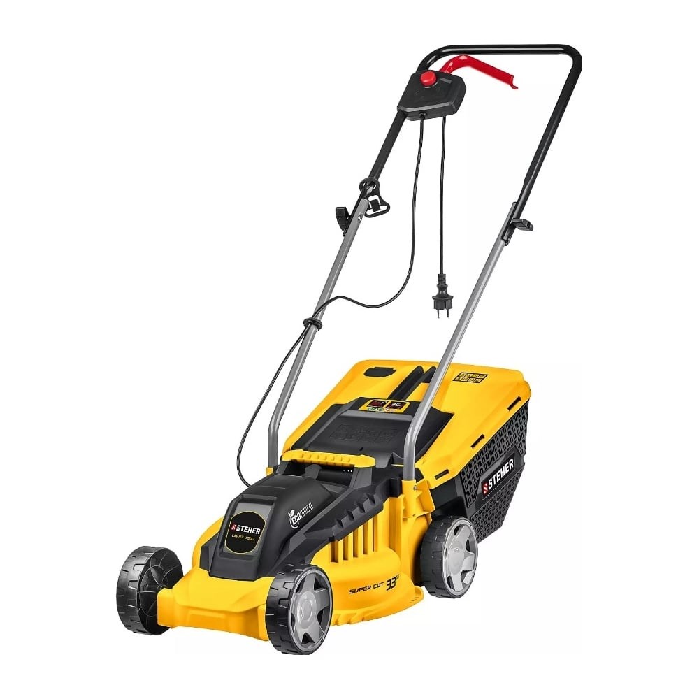 Сетевая газонокосилка STEHER 1300 Вт LM-33-1300 используется для кошения газонной травы на садовых участках и придомовых территориях. В комплект входит вместительный травоборник, для простоты его съема и установки предусмотренна рукоятка. Благодаря питанию от электросети газонокосилка не выделяет вредных для человека и окружающей среды выхлопов. Складная рукоятка позволяет экономить место во время хранения и транспортировки инструмента.