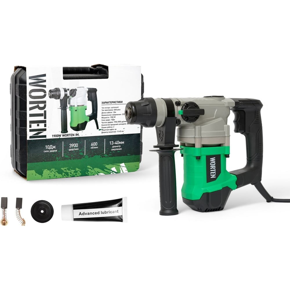 Перфоратор WORTEN SDS-plus сетевой 1900W функционирует в двух режимах :Режим 1- Удар + Сверление: винт повернут кнопкой влево. Режим 2 - Удар: винт повернут кнопкой вправо. Переключение между ними осуществляется при помощи тумблера сбоку на корпусе. Патрон SDS-plus обеспечивает быструю и легкую замену оснастки. Дополнительная рукоять способствует уверенному удержанию инструмента в руках. Наличие кейса решает вопрос хранения и транспортировки перфоратора. До 30.06.2026 на данный товар действует условие безусловного возврата.