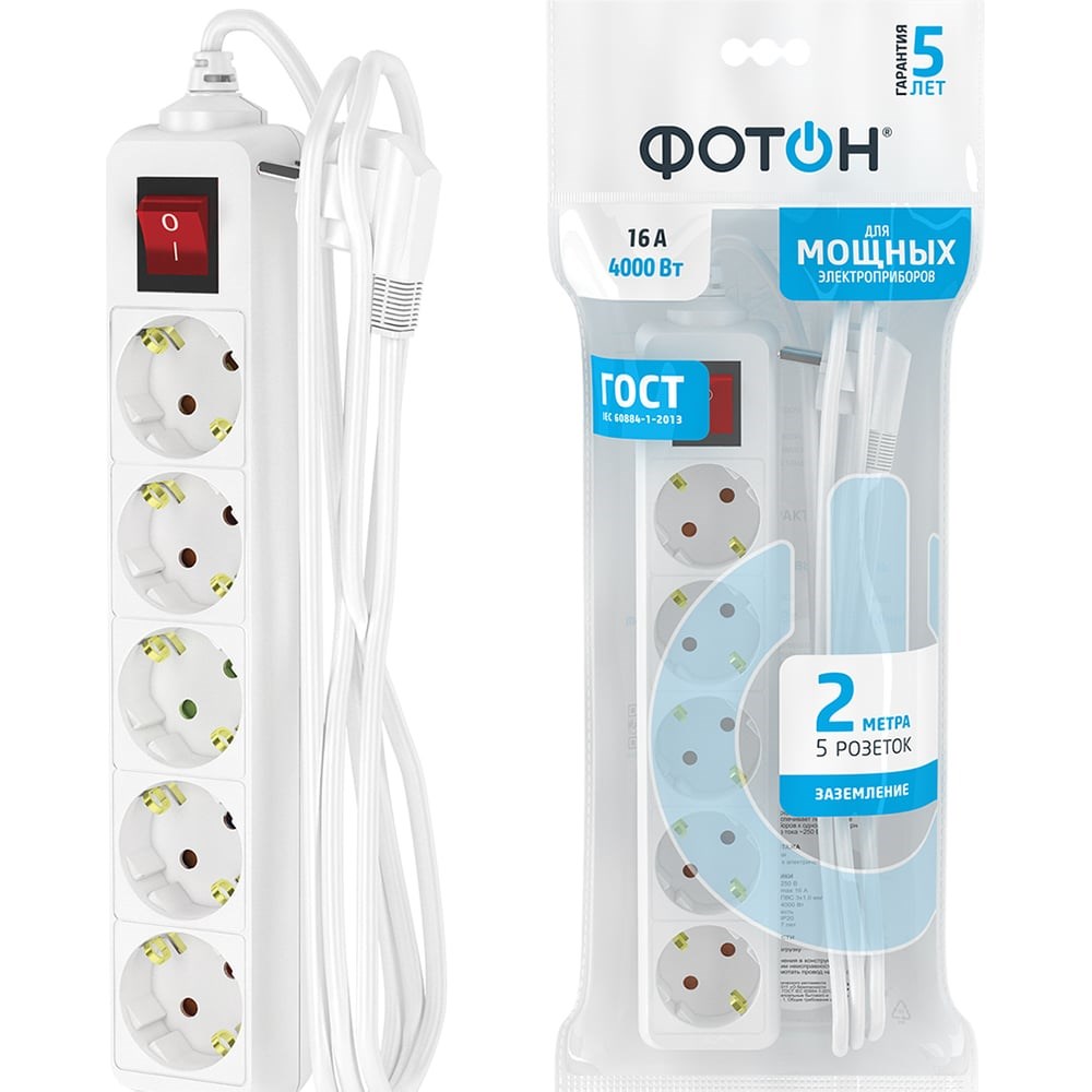 Удлинители C ЗАЗЕМЛЕНИЕМ рассчитаны на одновременное подключение приборов суммарной мощностью до 4000 Вт (номинальный ток - 16А). Они снабжены защитными шторками, прикрывающими контакты, для обеспечения дополнительной безопасности. Провод 3х1,0мм (квадратных) - сечение проводника 1,0 мм (квадратных). Латунная контактная группа обеспечивает высокую электропроводность и максимально плотный контакт со штырями вилки подключаемых приборов. Корпус изготовлен из термоустойчивого и ударопрочного ABS-пластика. Все удлинители ФОТОН предназначены для подключения к розеткам европейского стандарта. * Отсутствие искрения* Электро- пожаробезопасность Выключатель на корпусе удлинителя позволяет обесточивать все разъемы удлинителя одним нажатием кнопки. Защитный бортик высотой 12 мм исключает риски поражения электрическим током при случайном попадании пальца в зазор между вилкой и гнездовым разъемом. Вся продукция полностью соответствуют нормам российского ГОСТ и EAC.