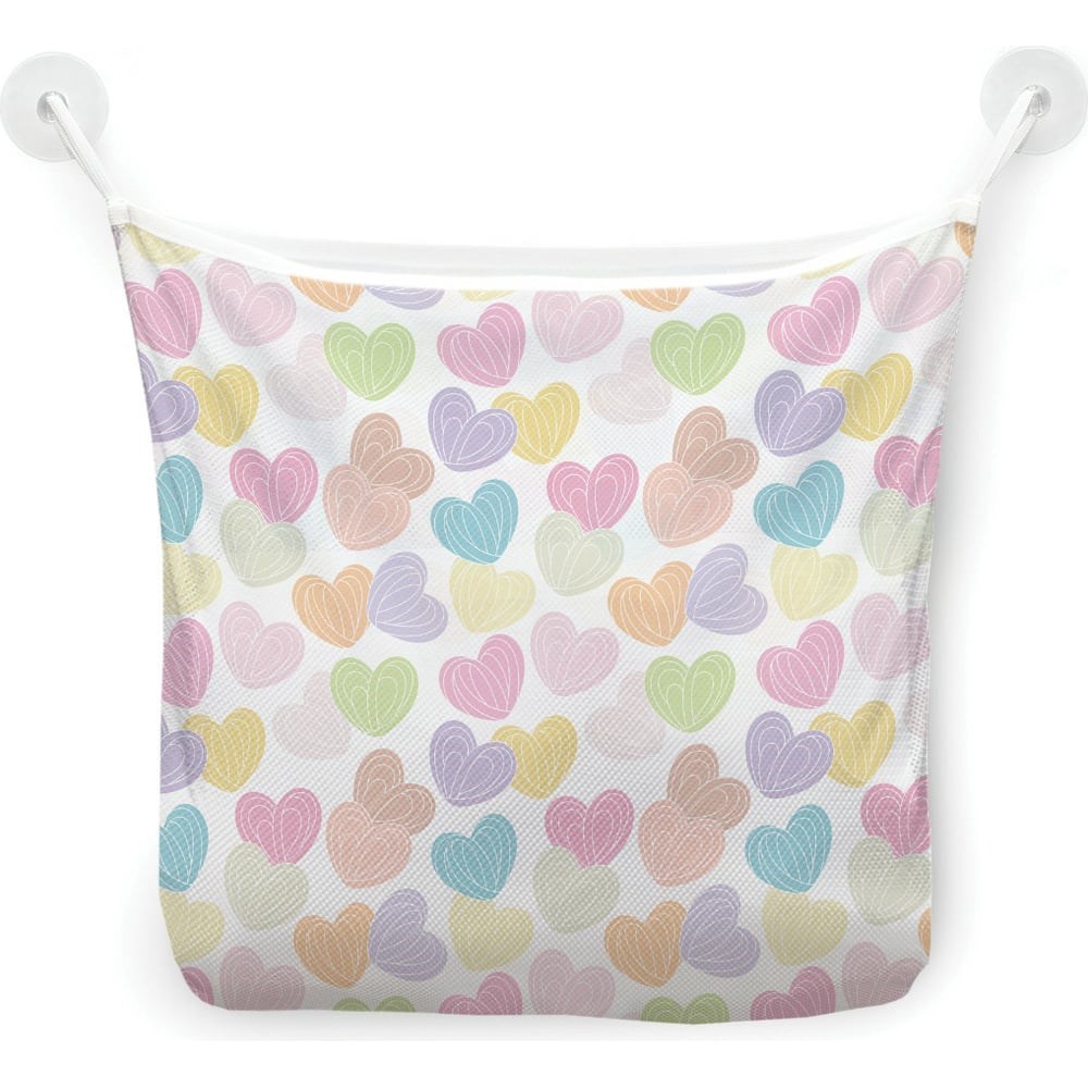 Сетка для игрушек в ванну JOYARTY "Карамельные сердца" настенный органайзер на присосках, 39x33 см tgb_422695 - это удобная и полезная вещь, с помощью которой вы в считанные минуты сможете навести порядок, удобно разместить игрушки и приучить ребенка к аккуратности и порядку. Материал органайзера для ванной комнаты - 100% полиэстер, поэтому она легко стирается, быстро высыхает и сохраняет свой первоначальный вид. Обращаем внимание! Сетка крепится на гладкую поверхность, предварительно очищенную от загрязнения и пыли, при помощи двух присосок. В первые несколько минут желательно не нагружать органайзер, чтобы присоски надёжно зафиксировались. Рекомендуем класть в сетку не более 750 грамм.