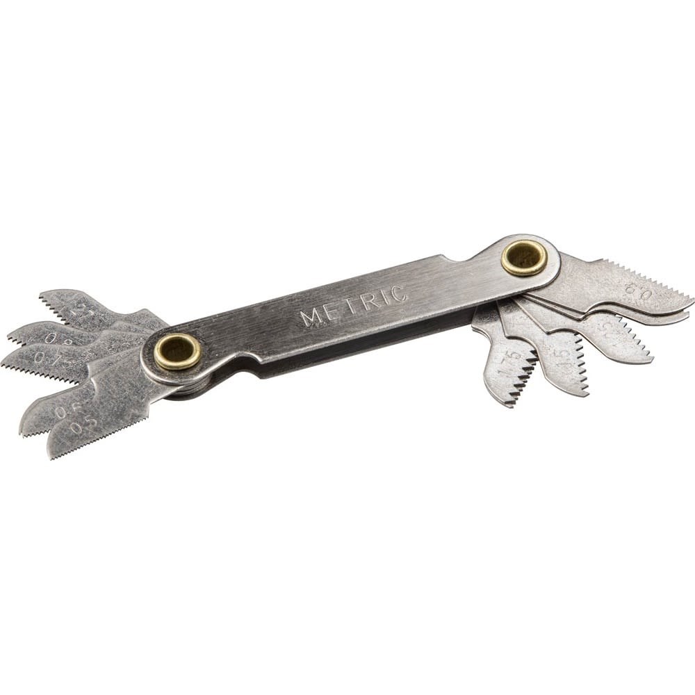 Шаблон для определения шага метрической резьбы STAYER PROFI 0,5-1,75 мм 28041 - приспособление, состоящее из 12 щупов, закрепленных в обойме. Шаг метрической резьбы: 0,5, 0,6, 0,7, 0,75, 0,8, 0,9, 1,0, 1,25, 1,5, 1,75 мм. Шаг трубной резьбы: 27, 28 TPI