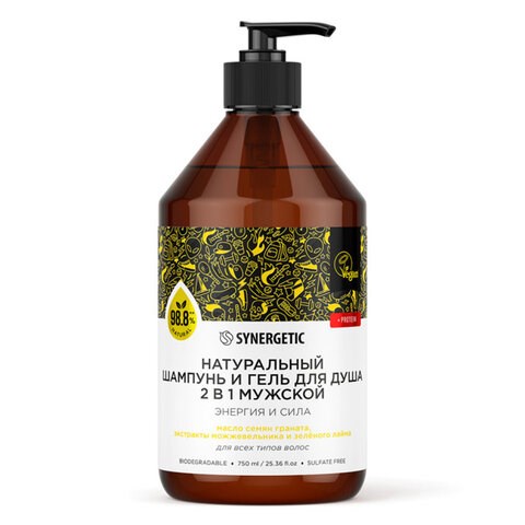 Шампунь + гель для душа мужской 750 мл, SYNERGETIC "Энергия и сила 2 в 1", 701754
