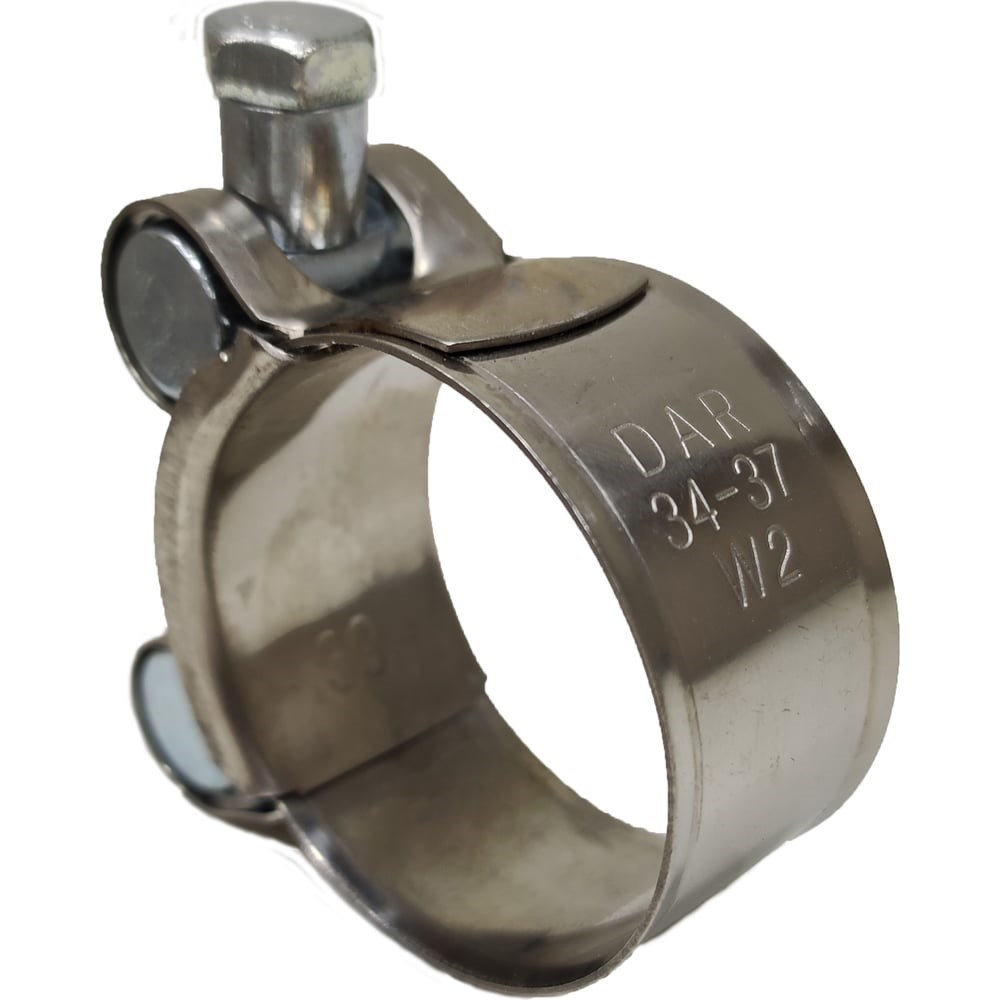 Шарнирный хомут DAR 34-37 50439 предназначен для монтажа толстостенных армированных рукавов, работающих под высоким давлением. Гладкая лента и развальцовка краев обеспечивают безопасное применение и исключают повреждение трубы или рукава при вибрации. В отличии от аналогов, шарнирный хомут DAR выдерживает двукратные моменты затяжки, а сварные точки не тянутся при гидроударах, что позволяет использовать его в ответственных соединениях, где предъявляются высокие требования безопасности. Данный хомут изготовлен из нержавеющей стали W2. (Лента и вкладыш - нержавеющая сталь. Втулка, шарниры и болт - оцинкованная сталь.)