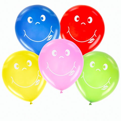 Высококачественные шары классической формы с рисунком "Смайл". Изготовлены из натурального латекса, обеспечивающего прочность изделия при аккуратном использовании. Стандартный размер - 30 см. 5 шаров 5 разнообразных насыщенных цветов украсят любой интерьер.