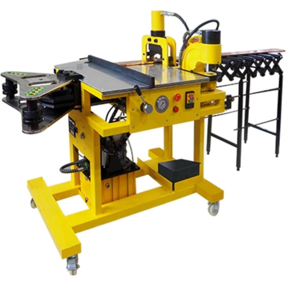 Шинообрабатывающий станок 3в1 SHTOK СРШ-200 21004 служит для резки, перфорации, гибки в вертикальной и горизонтальной плоскостях медной, алюминиевой токоведущей шины. Перфоратор с параллельным упором располагается у края рабочего стола, что дает возможность легко пробивать отверстия на фиксированном расстоянии. Перемещаемый рольганг предназначается для удобства подачи тяжелой шины. Благодаря аварийной кнопке останов агрегата в случае чрезвычайной ситуации осуществляется максимально быстро. Для мобильности и простоты перемещения оборудования в основании конструкции предусматривается наличие колес. Основные органы контроля и управления вынесены на лицевую панель, что способствует удобству эксплуатации. Габариты изделия составляют 1500х700х1100 мм.