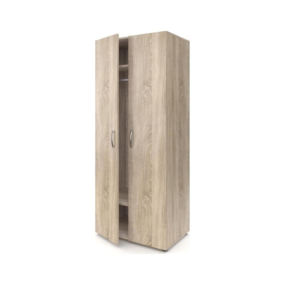 Шкаф выполнен из ЛДСП 16 мм и устанавливается на регулируемые опоры. Торцы фасадов закрыты противоударной кромкой ПВХ толщиной 2 мм. Фасады оснащены металлическими ручками. Шкаф оснащен полкой для головных уборов, полкой для обуви и металлической перекладиной для плечиков.