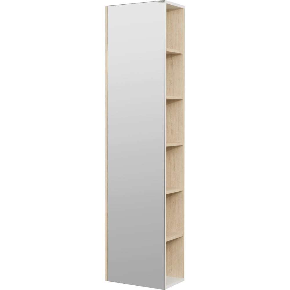 Шкаф-колонна AQUATON Сканди с зеркалом Белый/Дуб Верона 1A253403SDB20 00065178 в состав коллекции входит необычная шкаф - колонна, за зеркальными створками расположены нерегулируемые (верхние и нижние) и 3 регулируемые полочки (по центру), и разделенные перегородкой открытые полочки, таким образом, обеспечивая легкий доступ к открытым полкам без необходимости открывания фасада.
