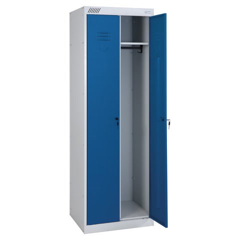 2 секции, 2 двери. 2 ключевых замка повышенной секретности. Цельносварная лицевая панель обеспечивает абсолютную жёсткость всей конструкции. Полка для головных уборов. Штанги для плечиков, крючки в комплекте. Вентиляционные отверстия в корпусе и двери. Держатель под личную карточку. Два вида крепежа в комплекте: саморезы и заклепки. Угол открывания двери 110°. Поставляется в разобранном виде.