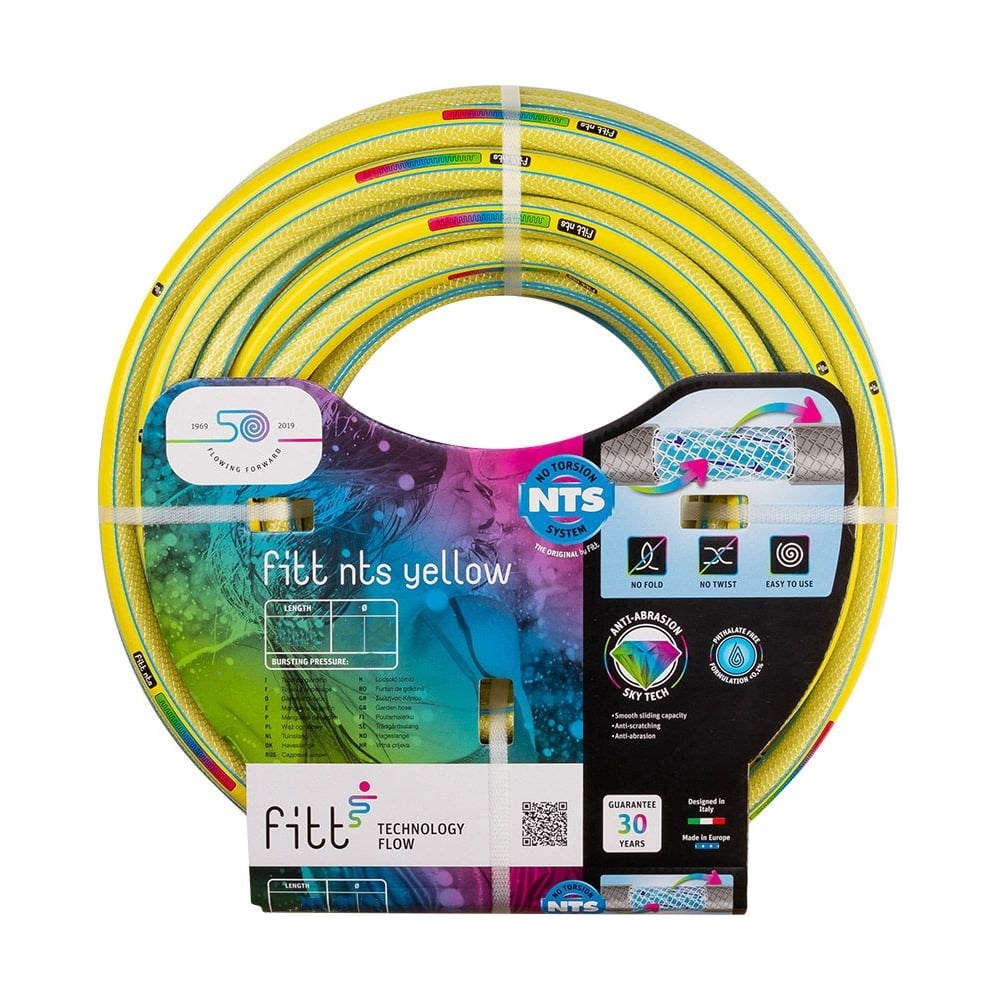 Шланг FITT NTS YELLOW 3/4", 50 м 3762500 - шланг для полива с оригинальным, необычным дизайном насыщенного желтого цвета. Состоит из шести слоев. Структура шланга: первый, внутренний слой желтого цвета; второй слой - черный, с добавками для предотвращения роста водорослей; следующий третий слой желтого цвета; четвертый слой - текстильное усиление NTS®; предпоследний пятый слой - это наружное прозрачное покрытие, шестой слой - пленка для защиты от УФ лучей SKY TECH® - предотвращает износ шланга и создает особую сатинированную поверхность. Срок службы: 30 лет.