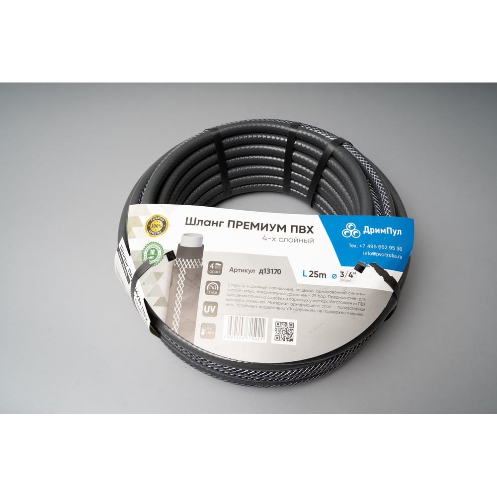 Шланг ПВХ представляет собой конструкцию, состоящую из нескольких слоев ПВХ и и армированием сеткой из высокопрочной полиамидной нити. Шланг изготавливается с чулочным вязанием нити, что способствует отсутствию изломов по всей длине шланга.Рабочее давление 15 бар.