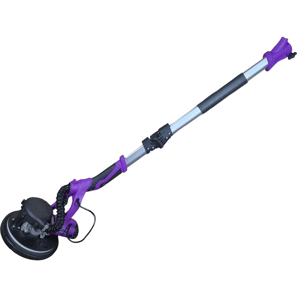 Шлифовальная машина с системой пылеудаления оснащена турбиной с регулировкой вакуума и светодиодной подсветкой рабочей зоны. Плавная регулировка скорости вращения от 500 до 2700 об/мин. Предназначена для шлифования стен и потолков после нанесения раствора, а также для удаления старой краски, остатков от старых обоев и т.д. Мощность шлифовальной машины 1380 Вт, что превышает минимальные требования в 500 Вт. Большая мощность двигателя положительно сказывается на ресурсе инструмента. Съемный край контура защитного кожуха тарелки (шасси) позволяет увеличить эффективность и уменьшить ручной труд (обработка поверхности у стыков и углов на 4 см больше). Телескопическая рукоятка с регулировкой длины позволяет работать со стенами и потолком высотой до 3 метров стоя на полу. Конструкцией машинки также предусмотрено вращение «головы» в разные стороны с углом наклона до 120 градусов. Подошва машинки оснащена тарелкой с липучкой для быстрой смены шлифовальной бумаги. Шлифовальная машина имеет складную конструкцию, что делает транспортировку и хранение более удобными.