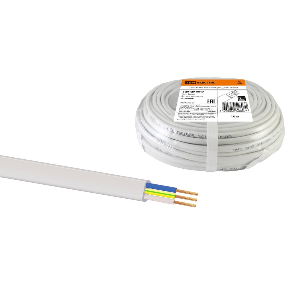 Шнур TDM ELECTRIC ШВВП 3x0,5 ГОСТ 10м, белый SQ0120-0017 служит для передачи и распределения электрической энергии в стационарных установках на номинальное переменное напряжение 0,66 и 1 кВ номинальной частотой 50 Гц. Применение: В быту Cтроительно-монтажные организации В промышленности Материалы: Проводник - многопроволочная медная жила (Cu) Изоляция - ПВХ (поливинилхлорид) Оболочка ПВХ.