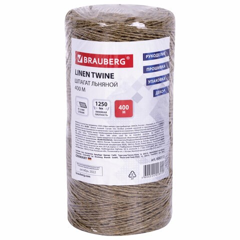 Шпагат льняной банковский, диаметр 1,5 мм, длина 400 м, линейная плотность 1250 текс, BRAUBERG, 600115