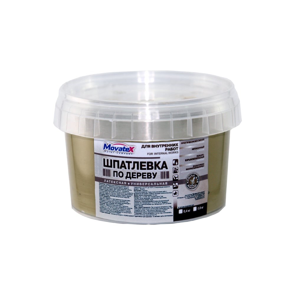 Шпаклевка по дереву (0.8 кг; дуб) Movatex Т16161 предназначена для внутренних работ. Используется для заделки трещин и выравнивания поверхности. Подходит для нанесения на бетон, кирпич, штукатурку, дерево, ДСП, оргалит, гипсокартон. Имеет превосходную пластичность и отлично шлифуется после высыхания, что позволяет осуществлять качественную подготовку поверхности под дальнейшую отделку: окраску, наклеивание обоев, нанесение декоративных покрытий.