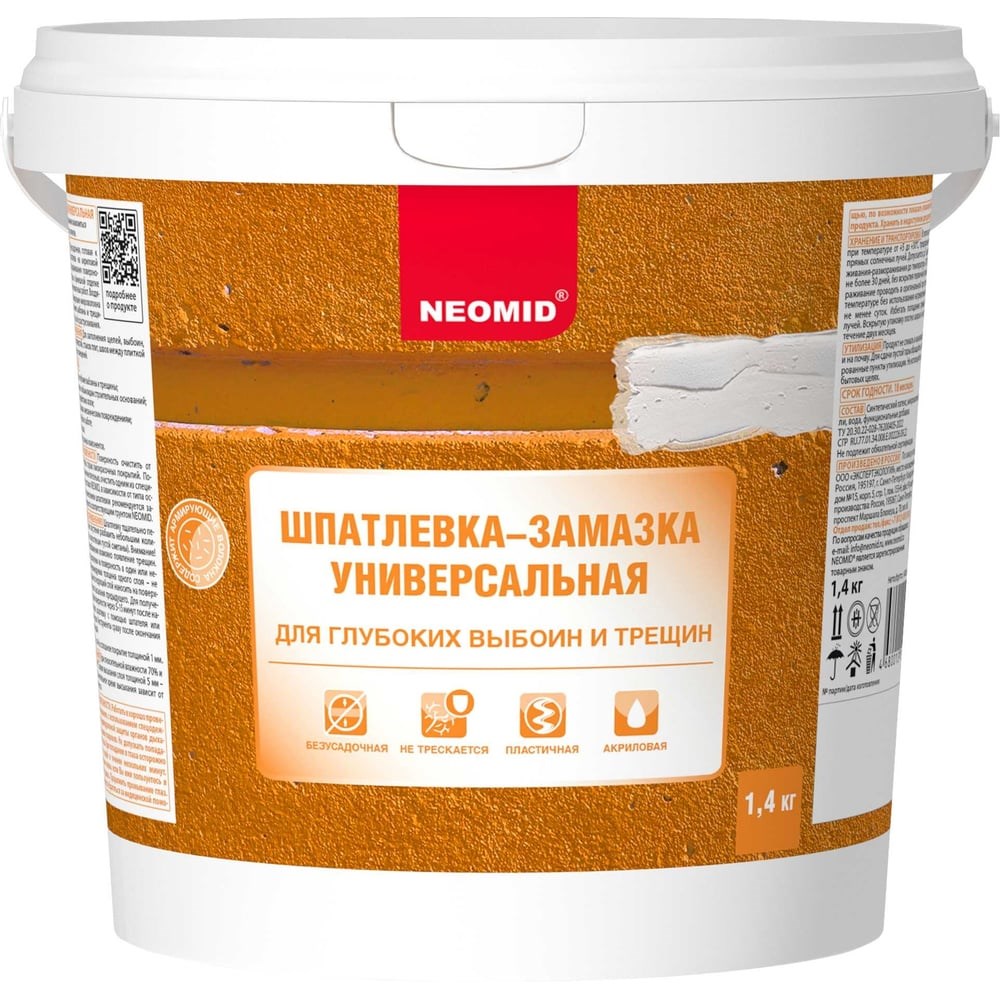 NEOMID Неомид Шпатлевка для выбоин и трещин (1,4 кг) ЭЭ безусадочная готовая к применению шпатлевка на акриловой основе предназначена для заделки глубоких выбоин, щелей и трещин при проведении ремонтных работ снаружи и внутри помещений. Обладает высокой адгезией к любым видам строительных оснований.