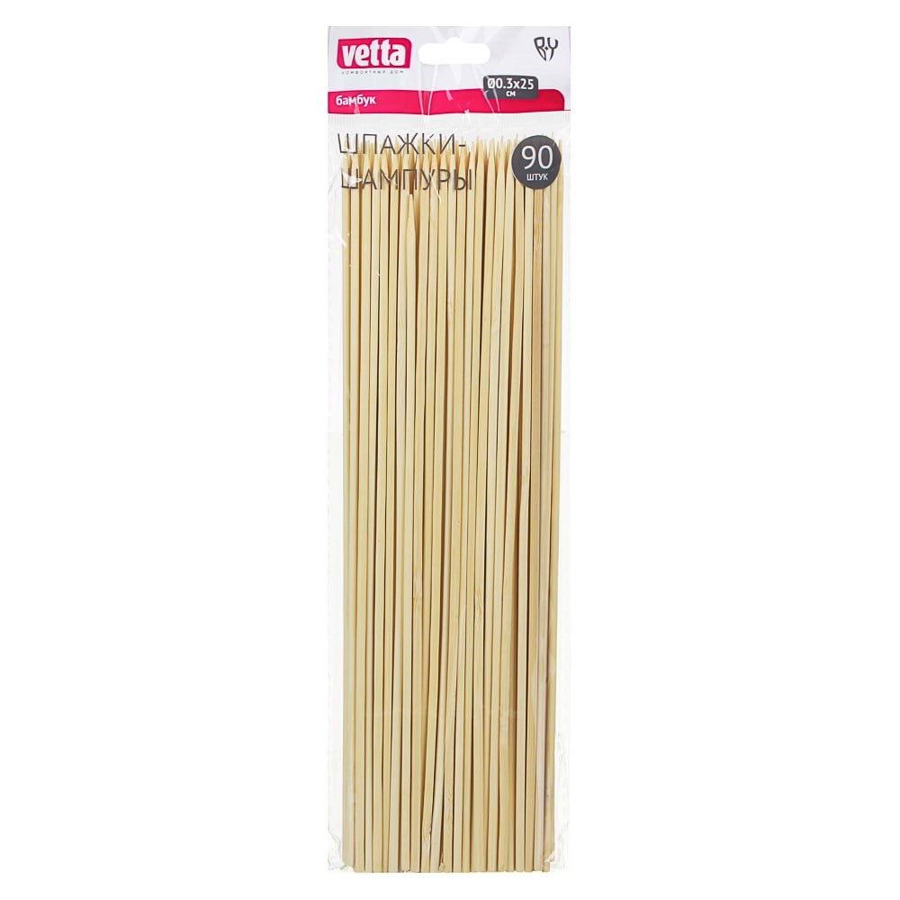 Шпажки-шампуры VETTA 90 шт., бамбук, 250х3 мм 437-208 подходят для приготовления пищи на открытом воздухе. Шампуры - незаменимые аксессуары для организации фуршета. Натуральный материал полностью безопасен для здоровья. Бамбук не меняет вкус продуктов, не впитывает запахи.