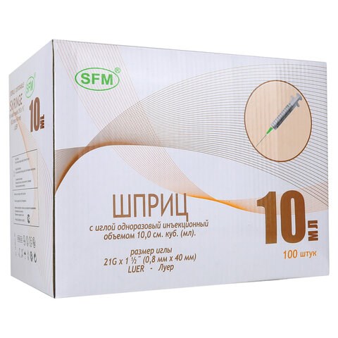 Шприц 2-х компонентный SFM, 10 мл, КОМПЛЕКТ 100 шт, в коробке, игла 0,8х40 - 21G, 534272