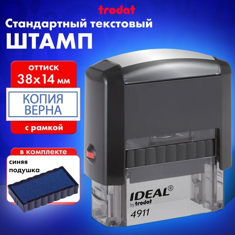 Штамп стандартный "КОПИЯ ВЕРНА" В РАМКЕ, оттиск 38х14 мм, синий, TRODAT IDEAL 4911 DB-3.45, 161491