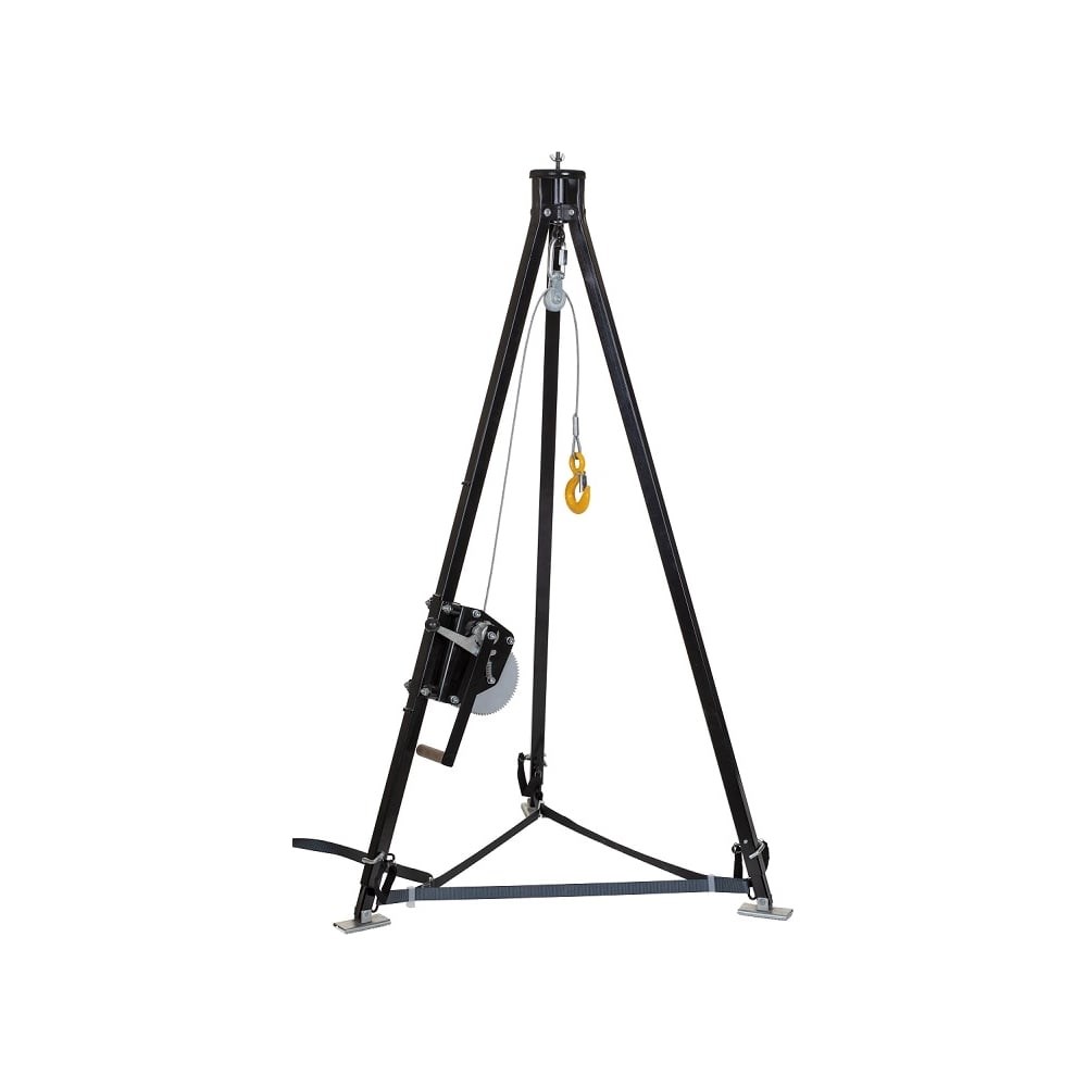Штатив тренога (трипод) ТМ-1ЛШтатив-треногаГоловная часть с анкерным болтом и крышкой фиксации стоек в рабочем положении.Три регулируемые стойки с опорными антифрикционными пластинами и штифтами для коррекции длины.Полиамидная привязь дополнительно предохраняющая стойки от перемещений при приложении нагрузки.Карабин с блоком для поддерживания каната лебедки при подъеме и опускании.Возможность регулирования положения лебедки в зависимости от установленной высоты трипода.ЛебедкаДлинная и удобная рукоятка для приложения крутящего момента.Дублированная для увеличения надежности и долговечности зубчатая передача.Простой и безопасный храповый механизм, предохраняющий от срыва.Кожух, защищающий канат и передачу от атмосферных осадков.Грузолюдской канат (ГЛ), оборудованный чалочным крюком, имеющий замок, предохраняющим выход д-звена спасательной привязи из зева.Назначение: удержание и эвакуация одного человекаКоличество точек крепления: однаСтатистическая максимальная нагрузка: 1 200 кгс (12 кН)Грузоподъемность: 250 кгМаксимально допустимая рабочая нагрузка: 315 кгДлина каната: 25 метровУсилие на рукоятке при работе: 25 кгс, не болееТормозной механизм: ручной, автоматическийРабочая высота: стойки выдвинуты — 2 140 мм, стойки задвинуты — 1 340 ммМасса: 23 кгРазмеры в сложенном состоянии: 1340х390х360 ммГабаритные данные с упаковкой: 1,8 х 0,45 х 0,35 мВес с упаковкой: 25кг