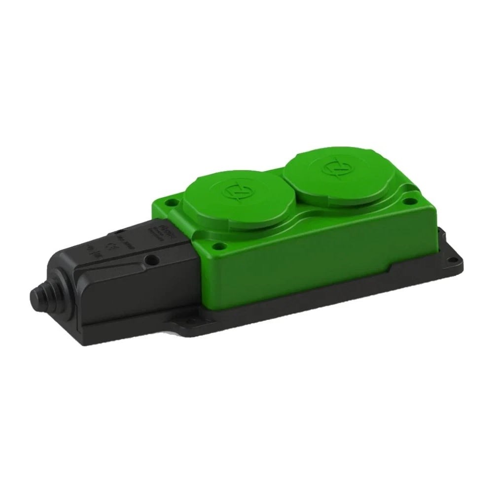 Штепсельная колодка NE-AD 2-гнезда с крышкой, с заземлением, 16А, IP54 (каучук), Зеленый 4132 предназначена для подключения электрооборудования и электроинструментов в сложных эксплуатационных условиях мощностью до 3,5 кВт. Штепсельные колодки из синтетического каучука успешно используются: В разных отраслях промышленности (для подключения электрических станков или проведения профессионального освещения). На стройплощадках (при прокладке временных кабельных линий и установки бытовок). В бытовых условиях (для электроснабжения торговых киосков, при организации выставочных площадей). В личных подсобных хозяйствах (для подключения электрооборудования и электроинструментов) и т.д. Изделие подходит для эксплуатации в суровых условиях - на открытом воздухе или во влажных или запыленных помещениях - IP54.