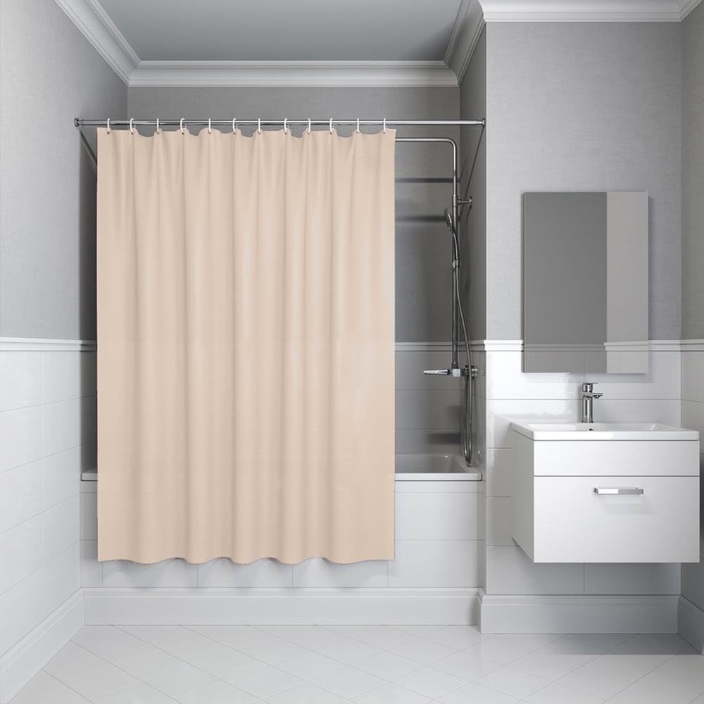 Однотонная непрозрачная штора для ванной цвета кофе с молоком. Изготовлена из современного материала PE – мягкого, прочного, приятного на ощупь, экологичного и безвредного для здоровья термопластика (толщина 0,09 мм). Без неприятного запаха, благодаря чему шторку для ванной можно использовать уже в день покупки. 12 прозрачных пластиковых колец в комплекте, штора готова к использованию. По верхнему краю 12 штампованных отверстий-люверсов – кольцо/крючок легко пройдет насквозь, не повредив шторы. Материал PE на 100% водонепроницаем и надежно защищает от брызг, не подвержен развитию плесени и грибка. Просто ухаживать: достаточно протереть салфеткой с мылом и промыть под душем. При этом штору можно даже не снимать с карниза.