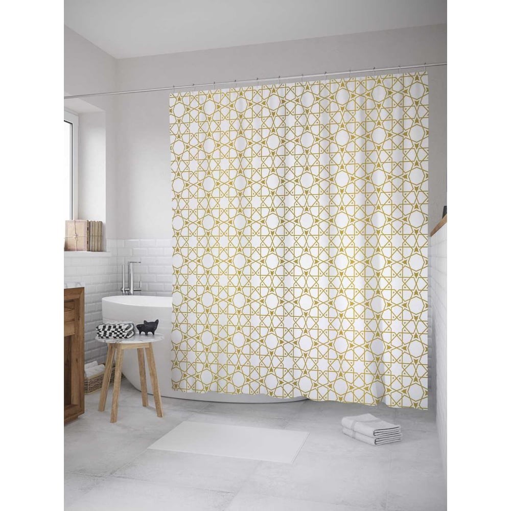 В отличие от подобных изделий из ПВХ и силикона, занавеска в ванную, пошитая из полиэстера, выгодно отличается красивым внешним видом, прочностью и длительным сроком службы. Водонепроницаемая ткань плотностью 80 г/м2 украшена стильным разноцветным принтом - нанесенная краска не боится контакта с горячей водой и не выцветает с течением времени. В комплект шторы для ванной размером 180х220 см входит 12 крючков, для которых уже подготовлены все нужные отверстия. Стиль: этнический. Принт: Золотая клетка. Цвет: золотистый, белый. Рисунок: орнамент. Теги: орнамент, узоры, фигуры. При покупке нужно учесть, что фактический размер изделия может отличаться от заявленного в пределах не более 5 см.