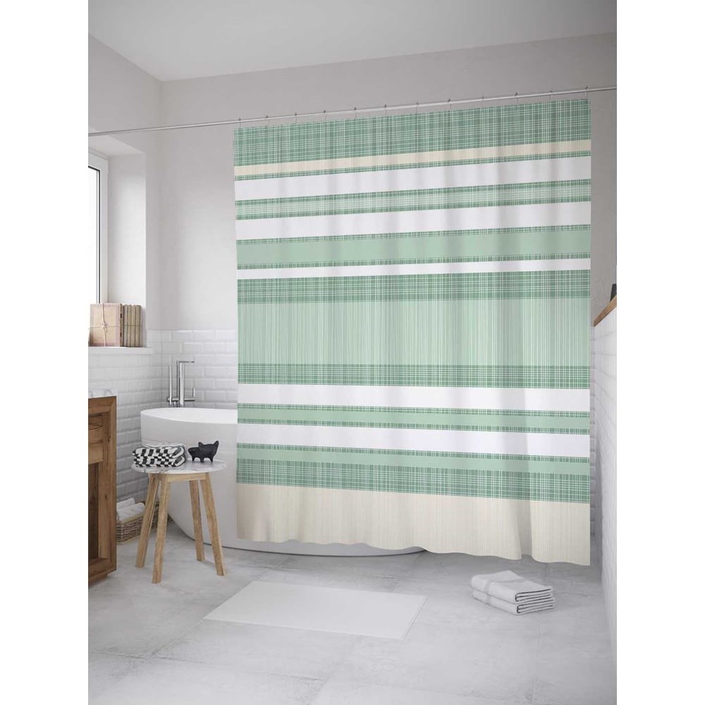 В отличие от подобных изделий из ПВХ и силикона, занавеска в ванную, пошитая из полиэстера, выгодно отличается красивым внешним видом, прочностью и длительным сроком службы. Водонепроницаемая ткань плотностью 80 г/м2 украшена стильным разноцветным принтом - нанесенная краска не боится контакта с горячей водой и не выцветает с течением времени. В комплект шторы для ванной размером 180х220 см входит 12 крючков, для которых уже подготовлены все нужные отверстия. Стиль: геометрический. Принт: Полосы на полотенце. Цвет: серо-зеленый, бежевый, белый. Рисунок: полоска. Теги: полосы, полоска, полосочки, расцветка, линии, цвета. При покупке нужно учесть, что фактический размер изделия может отличаться от заявленного в пределах не более 5 см.
