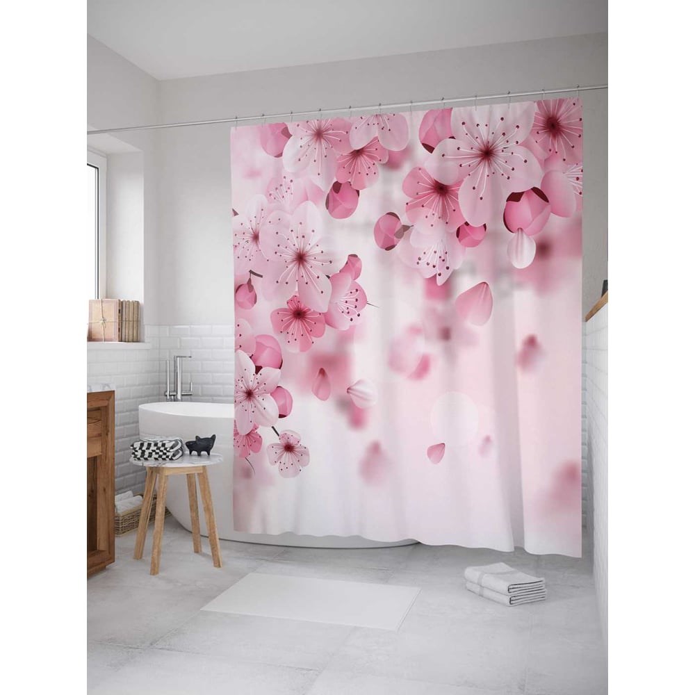 В отличие от подобных изделий из ПВХ и силикона, занавеска в ванную, пошитая из полиэстера, выгодно отличается красивым внешним видом, прочностью и длительным сроком службы. Водонепроницаемая ткань плотностью 80 г/м2 украшена стильным разноцветным принтом - нанесенная краска не боится контакта с горячей водой и не выцветает с течением времени. В комплект шторы для ванной размером 180х220 см входит 12 крючков, для которых уже подготовлены все нужные отверстия. Стиль: цветочный. Принт: Лепестки цветов. Цвет: розовый, бледно розоватый, белый. Рисунок: цветы и растения. Теги: цветы, лепестки, вишня, бутоны. При покупке нужно учесть, что фактический размер изделия может отличаться от заявленного в пределах не более 5 см.