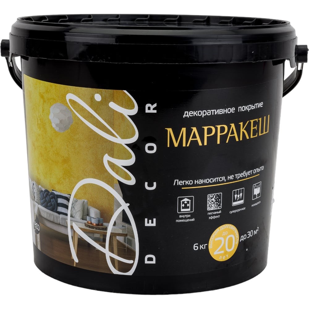 ШТУКАТУРКА ДЕКОР DALI-DECOR МАРРАКЕШ 6 КГ 39980 - защитно-декоративная обработка стен, колонн, потолков и различных элементов интерьера в отапливаемых и неотапливаемых жилых и общественных помещениях, в том числе с повышенной влажностью воздуха и интенсивной эксплуатационной нагрузкой. Область применения: Применяется внутри помещений по минеральным (бетон, кирпич, гипс, цемент, гипсокартон, шпатлевка, штукатурка и т. д.) и другим (ДВП, ДСП, МДФ и т. д.) поверхностям. Класс пожарной опасности КМ 1 Разрешена для обработки путей эвакуации. Разрешена к применению в детских, дошкольных, лечебных и общеобразовательных учреждениях.