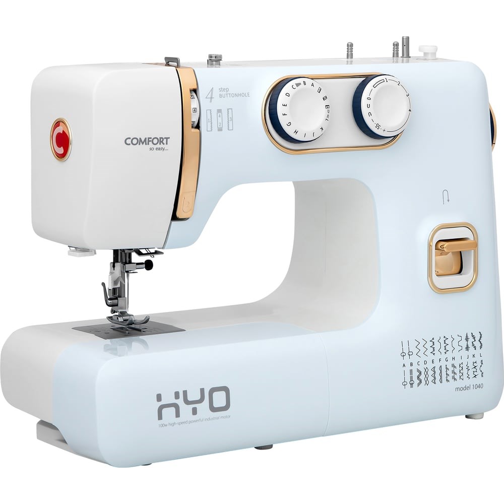 Профессиональная швейная машина Comfort 1040 выпущена в 2023 году на крупнейшей китайской фабрике Ямата (YamatoSewingMachine),которая специализируется на выпуске промышленного швейного оборудования. Предлагая свою конструкцию для изготовления бытовых швейных машинок для российского бренда Comfort, инженеры, особо подчеркнули, что не будут закупать и ставить на свою продукцию маломощные двигатели, которые используются на всех остальных бытовых швейных машинках, а установят моторы собственного производства, эти моторы используются для промышленных швейных машин. Мощность модели Comfort 1040 составляет 100 Вт. Большая мощность и увеличенное расстояние полезного вылета позволяет уверенно позиционировать новую модель в класс профессиональной швейной техники. Потрясающий дизайн и удивительно удачное его цветовое решение позволят помимо рабочих качеств получать эстетическое удовольствие. Модель выполнена в нежном голубом цвете с золотой глянцевой отделкой. Маховое колесо и переключатели имеют прорезиненные компоненты синего цвета. Швейная машина Comfort 1040 не перегружена лишними операциями и рекламными функциями. 24 строчки и полуавтоматическое выполнение петли под пуговицы одновременно обеспечивают опытного пользователя всем необходимым для полноценного изготовления любой одежды из любых материалов и, в то же время позволят начинающим не «запутаться» в ненужных опциях и максимально комфортно и быстро освоить полезное и интересное хобби.