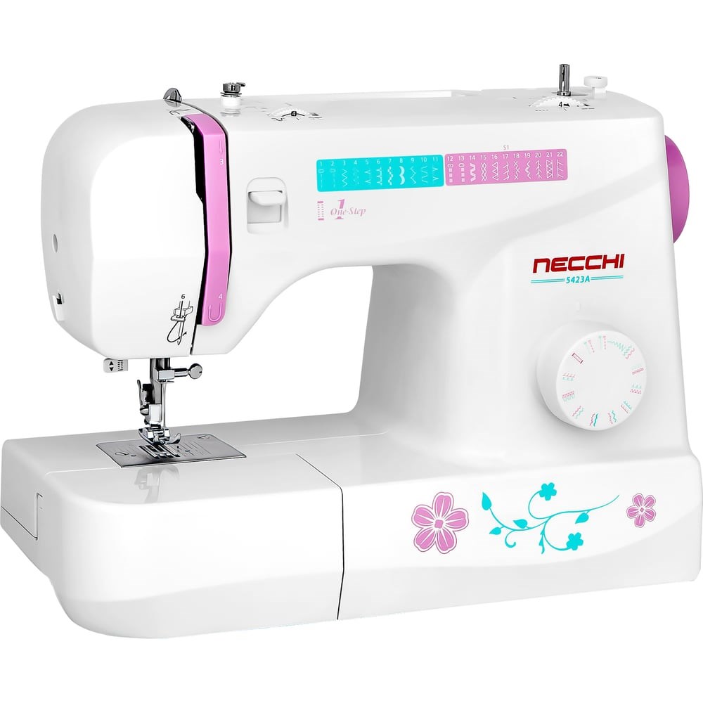Белоснежный корпус NECCHI 5423A украшен орнаментом нежных оттенков для вдохновения и хорошего настроения при работе. В комплекте к машине идут самые необходимые аксессуары. Так же в модели предусмотрена лапка для автоматического выметывания пуговичной петли, что существенно облегчает и ускоряет процесс самостоятельного изготовления изделий на пуговицах. Пуговица, для которой нужно вышить петлю вставляется в лапку, и машинка за один прием вышивает петлю под размер этой пуговицы. Данная версия швейной машины – прекрасный домашний многофункциональный помощник в работе со всеми видами тканей.23 швейные операцииРабочие, трикотажные, оверлочные и декоративные строчкиАвтоматическое вымётывание пуговичной петлиАвтоматическая намотка шпулькиСветодиодная подсветкаТочная регулировка натяжения нитейМеталлический вертикальный челнокСвободный рукавСъемные прижимные лапкиРеверс для закрепки шваБоковой обрезчик нитейМеталлическая станинаДлина стежка 0,0 – 4,0 ммШирина стежка 0,0 – 5,0 ммВысота подъема лапки до 12 ммСкорость шитья до 720 строчек в минутуМощность двигателя 70 ВтВес нетто - 6 кг, брутто - 6,8 кгРазмер машины 37х28х16 смРазмер коробки 43х34х23 смКомплект аксессуаров находится внутри съемного столика