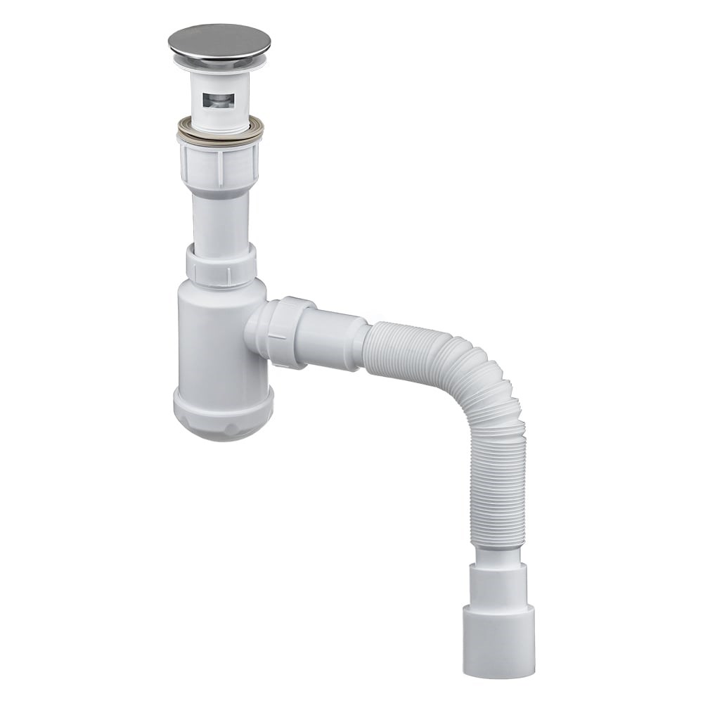 Сифон для выпуска 40-52 мм, 1.1/4"х40, клик-клак, с гофротрубой 40x40/50 MasterProf ИС.110634 устанавливается в раковины умывальников с диаметром выпускного отверстия 40-52 мм. Выполнен сифон из первичного полипропилена, что гарантирует высокую прочность, надежность и долговечность изделия.Сифон оснащен донным клапаном с механизмом клик-клак. Перекрыть слив воды в сливное отверстие можно быстро и легко. Кнопка механизма с хромовым покрытием надолго сохранит декоративный эффект и радость в глазах пользователя.