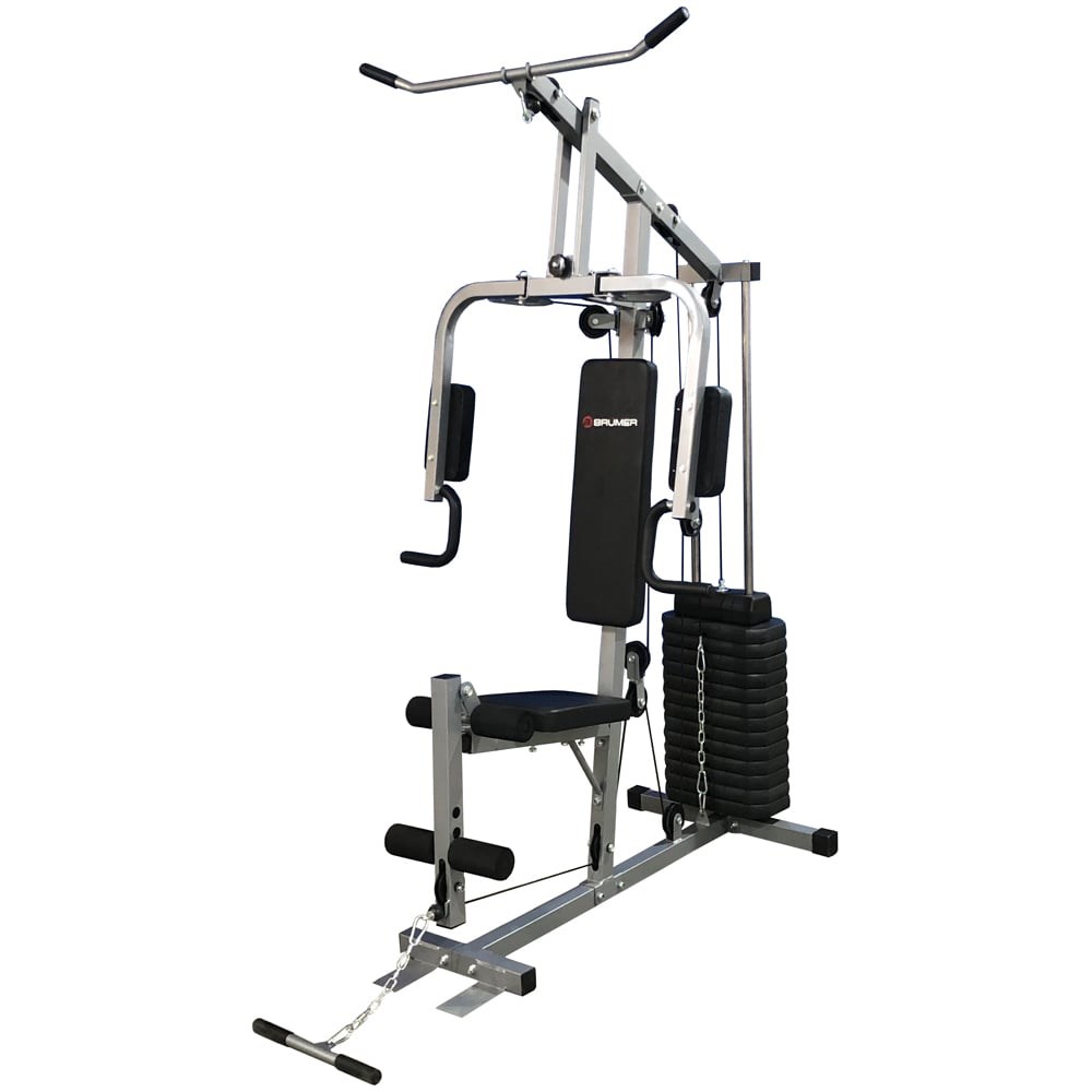 Силовой тренажер BRUMER Basic 4690222171280 подходит для домашнего спортзала. Позволяет выполнять жим от груди, жим от плеч, баттерфляй, верхнюю и нижнюю тяги, разгибание, отведение и приведение ног. Вес грузоблока составляет 63 кг. Максимальный вес пользователя - 100 кг.