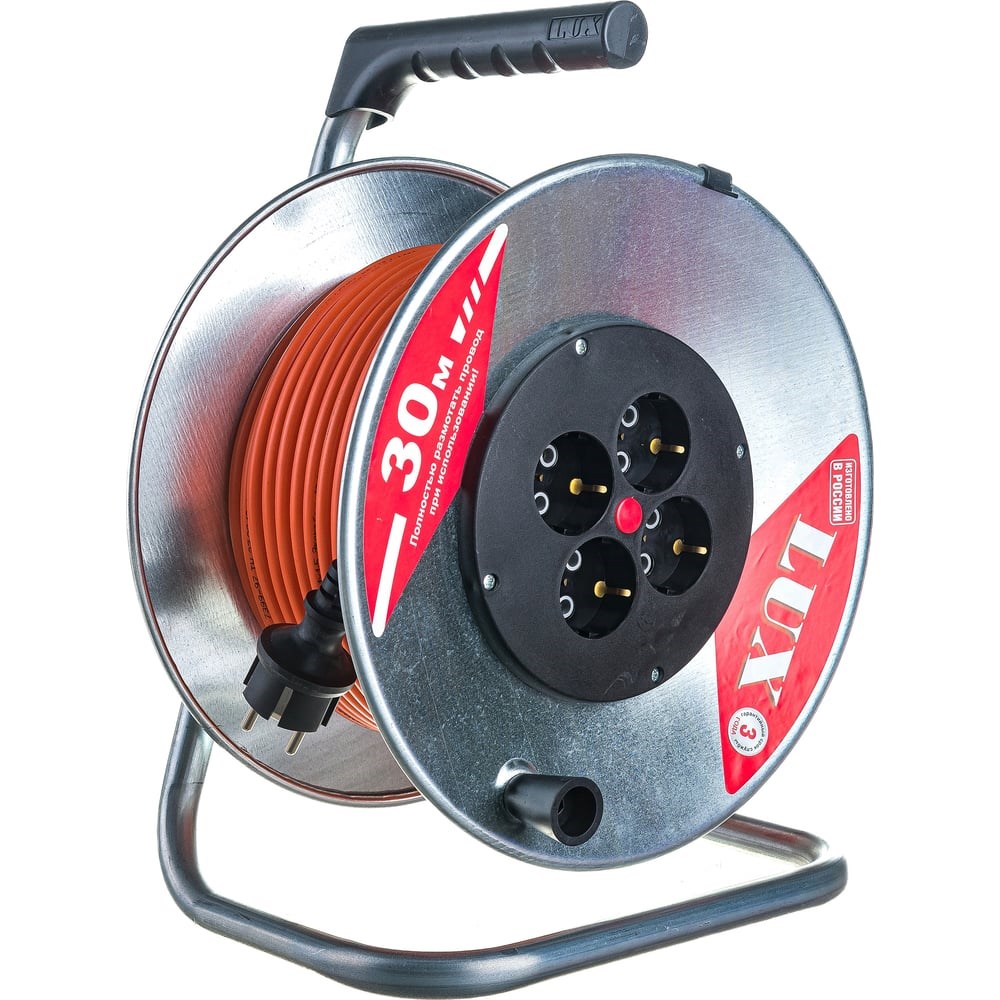Силовой удлинитель на металлической катушке LUX К4-Е-30 30м 4 розетки с з/к 40130 4606400419426 позволяет присоединять до четырех электрических приборов одновременно, которые находятся на удалении до 30 м от стационарной розетки. Провод с сечением жил 3х1.5 расположен на металлической катушке. Корпус изолирован от стойки при помощи пластмассового фланца.