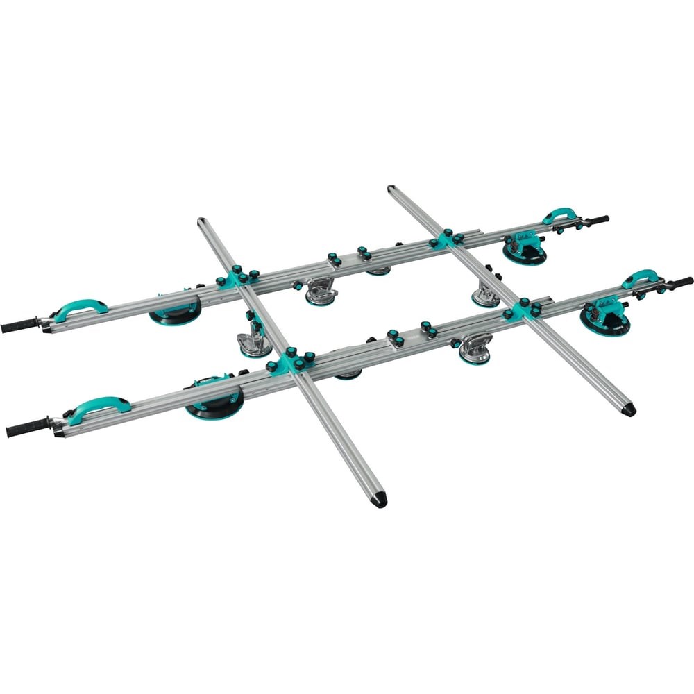 Система транспортировки BIHUI SLIM TRANS специально разработана для подъёма, перемещения и укладки крупноформатной плиткой, максимальной длиной до 320см, шириной до 160см и весом до 130кг. Состоит из 2 усиленных телескопических профилей из экструдированного алюминия, которые могут принимать различную форму и адаптироваться под разную плитку (регулируются от 165 до 320см) и двух поперечных штанг улучшающих прочность и стабильность системы, особенно при манипуляциях с тяжёлой плитой. Для переноски плит небольшой ширины можно использовать только один профиль. Система имеет4 рукоятки (по2 на профиль) положение которых возможно изменять по всей длине профиля, адаптируя систему под формат керамогранита. Переноска крупноформатной плитки BIHUI SLIM TRANS оснащена 4 вакуумными присосками с пневмопомпой диаметром 203мм (8 дюймов) и 4 обычными рычажными присосками диаметром 115мм. Положение присосок регулируется, что позволяет пользователю установить их так, чтобы максимально безопасно и удобно манипулировать заготовкой. Помповые присоски снимаются и ими можно пользоваться отдельно для ручной переноски и укладки плитки.