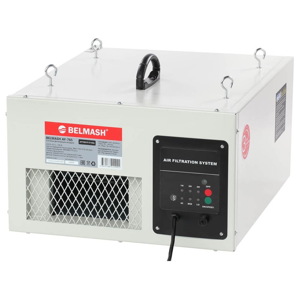 Система фильтрации BELMASH AF-765предназначена для очистки воздуха в производственных помещениях (столярных мастерских и т.п.) объемом до 140 м. куб.Система фильтрации используется для:Защиты здоровья (мелкодисперсная древесная пыль, вызывает раздражение глаз и гортани, попадая в легкие может вызвать аллергию и другие хронические заболевания, становятся причиной кожных раздражений)Пожарной безопасности. Отходы деревообработки огнеопасны, а пыль, полученная в процессе шлифовки может быть взрывоопаснойЗащита от влаги. Она присутствует не в самостоятельном виде, а в составе волокон древесины. Если не обеспечить удаление, начнется образование плесени и грибка, которые могут пагубно повлиять на здоровье и привести к порче заготовок/готовой продукцииОсобенности:Двухступенчатая фильтрация (наружный фильтр грубой очистки до 5 мкм и внутренний – тонкой очистки до 1 мкм)Высокая производительность, позволяющая фильтровать воздух в помещении в трех режимах (600, 680, 770м.куб в час)Установки таймера на 1, 2, 4 часаДистанционное управление с пультаЛегкая замена фильтра без специального инструментаДва варианта установки: подвесной и напольный