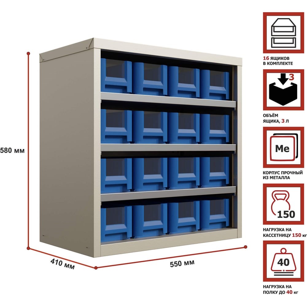 Система хранения с пластиковыми ящиками HONEYCOMB Ironbox Mini-400 M-KSV4109 поставляется с полочными контейнерами SK 4109 размером 400х117х90 мм. Корпус кассетницы сконструирован таким образом, что пристыковывать (скручивать) дополнительные корпуса можно в линию, вертикально (желательно не больше трех), спинами корпусов. Также допускается установка корпуса кассетниц на мобильные и бимобильные (в случае крепления спина к спине) основания. Дополнительные характеристики: нагрузка на одну полку до 40 кг, нагрузка на кассетницу - до 150 кг, цвет - серый (RAL7035). Каждый контейнер снабжен одним поперечным разделителем, что позволяет хранить несколько наименований товара в одной емкости. Маркирование контейнеров осуществляется при помощи прозрачных фронтальных панелей, что существенно облегчает поиск товара.
