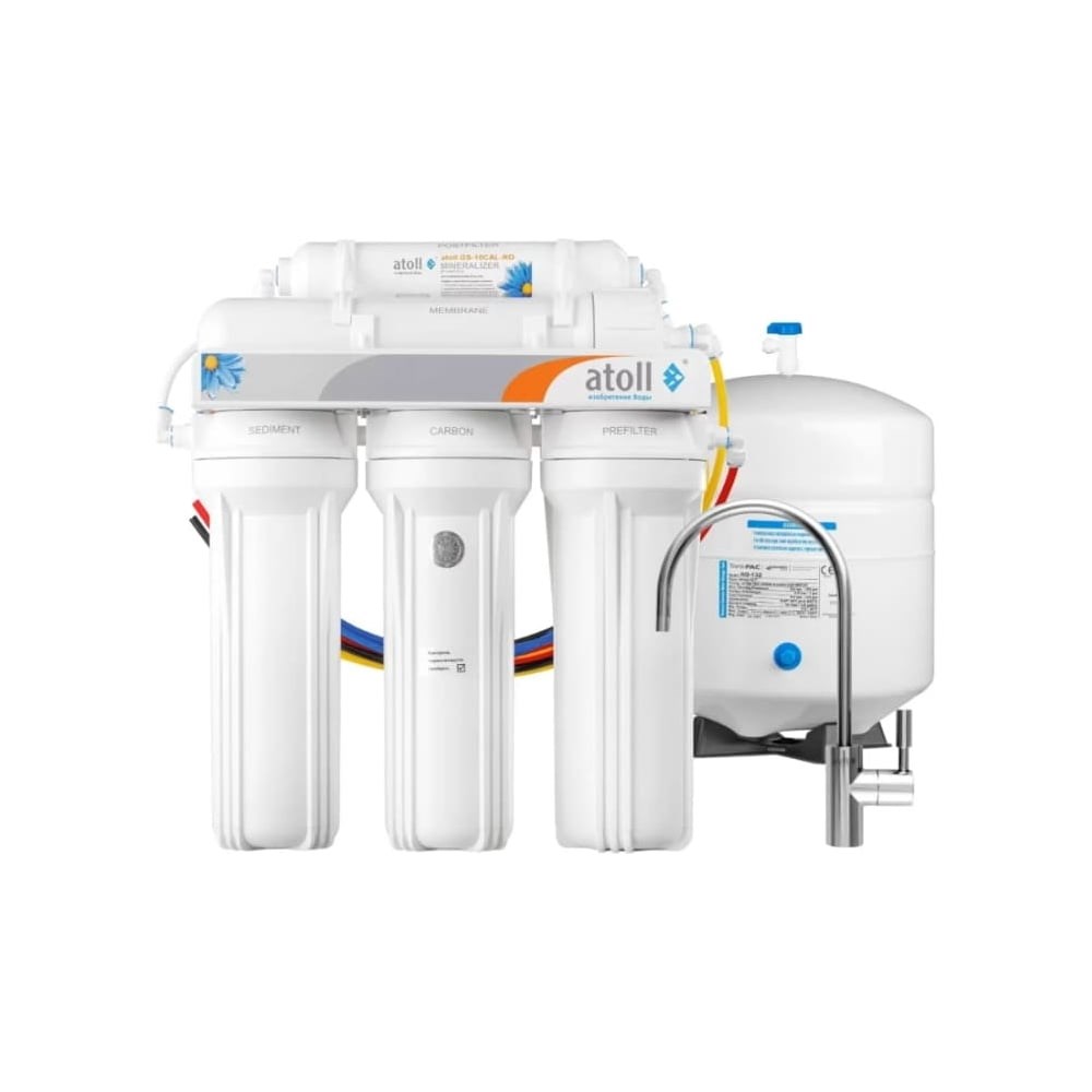 Atoll A-550m STDA — это обратноосмотическая система очистки питьевой воды с минерализатором. Процесс фильтрации на основе полупроницаемой полиамидной тонкопленочной мембраны исключает применение химических веществ.Первые три ступени очистки префильтрами:механической очистки воды — atoll P5 из полипропилена. Задерживает примеси крупнее 5 мкм;от органических примесей — atoll GAC-10 (гранулированный активированный уголь) удаляет из воды хлор, улучшает органолептические качества воды;тонкой механической очистки — atoll P1 из полипропилена. Служит для удаления грязи и нерастворимых частиц крупнее 1 мкм.После предварительной фильтрации вода в atoll A-550m STDA проходит следующие уровни очистки:полиамидной тонкопленочной мембраной atoll TW40-1812-50. Очищает воду от примесей тяжелых металлов, органических и неорганических соединений, бактерий и вирусов, пропускает через себя только молекулы воды и кислорода;минерализатором atoll GS-10CAL/RO — постфильтрация. Дополнительная очистка фильтром на основе гранулированного кокосового активированного угля, обогащенного кальцитом.Префильтры и постфильтр необходимо заменять с периодичностью раз в 6 месяцев, мембрану — 1 раз в 2 года. Срок службы элементов зависит от качества исходной воды.
