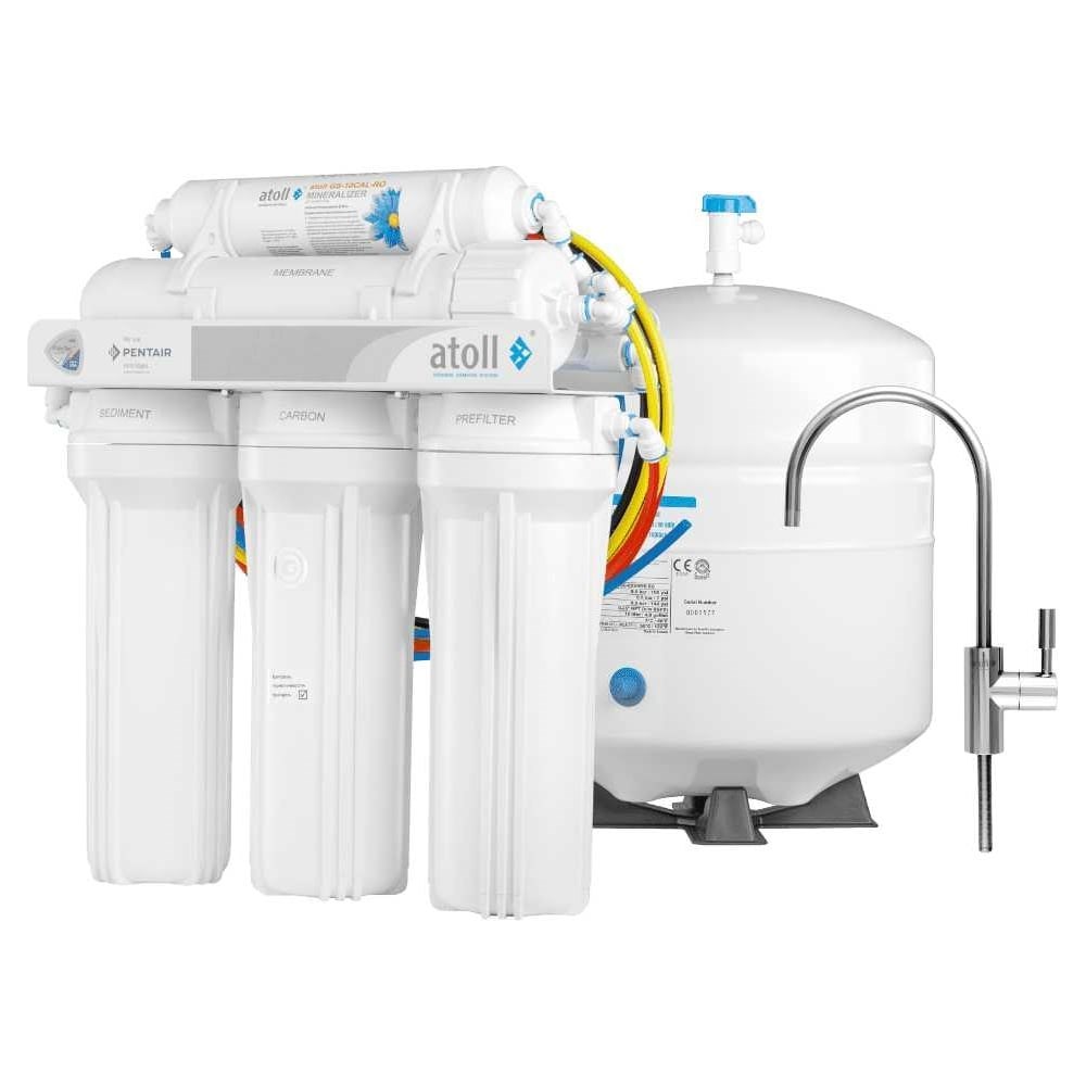 Обратный осмос atoll A-575m STD с минерализатором – это система повышенной производительности (75 GPD, 195 л/сутки) для очистки холодной питьевой воды (5 ступеней очистки). Процесс фильтрации на основе полупроницаемости полиамидной тонкопленочной мембраны исключает применение химических веществ. Три ступени очистки картриджами: Pentair (Pentek) P5 – механической очистки. Задерживает частицы песка, грязи и прочие загрязнения крупнее 5 мкм; Pentair (Pentek) GAC-10 (гранулированный активированный уголь) – от хлорорганических примесей. Удаление из воды хлора, улучшение органолептических свойств воды; Pentair (Pentek) P1 – механической очистки. Служит для удаления грязи и нерастворимых частиц крупнее 1 мкм. Вода после первых трех ступеней очистки проходит следующие две: обратноосмотической полупроницаемой мембраной Filmtec BW60-1812-75 – основная ступень. Производит очистку от примесей тяжелых металлов, солей жесткости, органических и неорганических соединений, бактерий и вирусов; постфильтром-минерализатором GS-10CAL/RO на основе порошкового активированного угля и кальцита. Улучшает вкус и запах, корректирует ph воды.