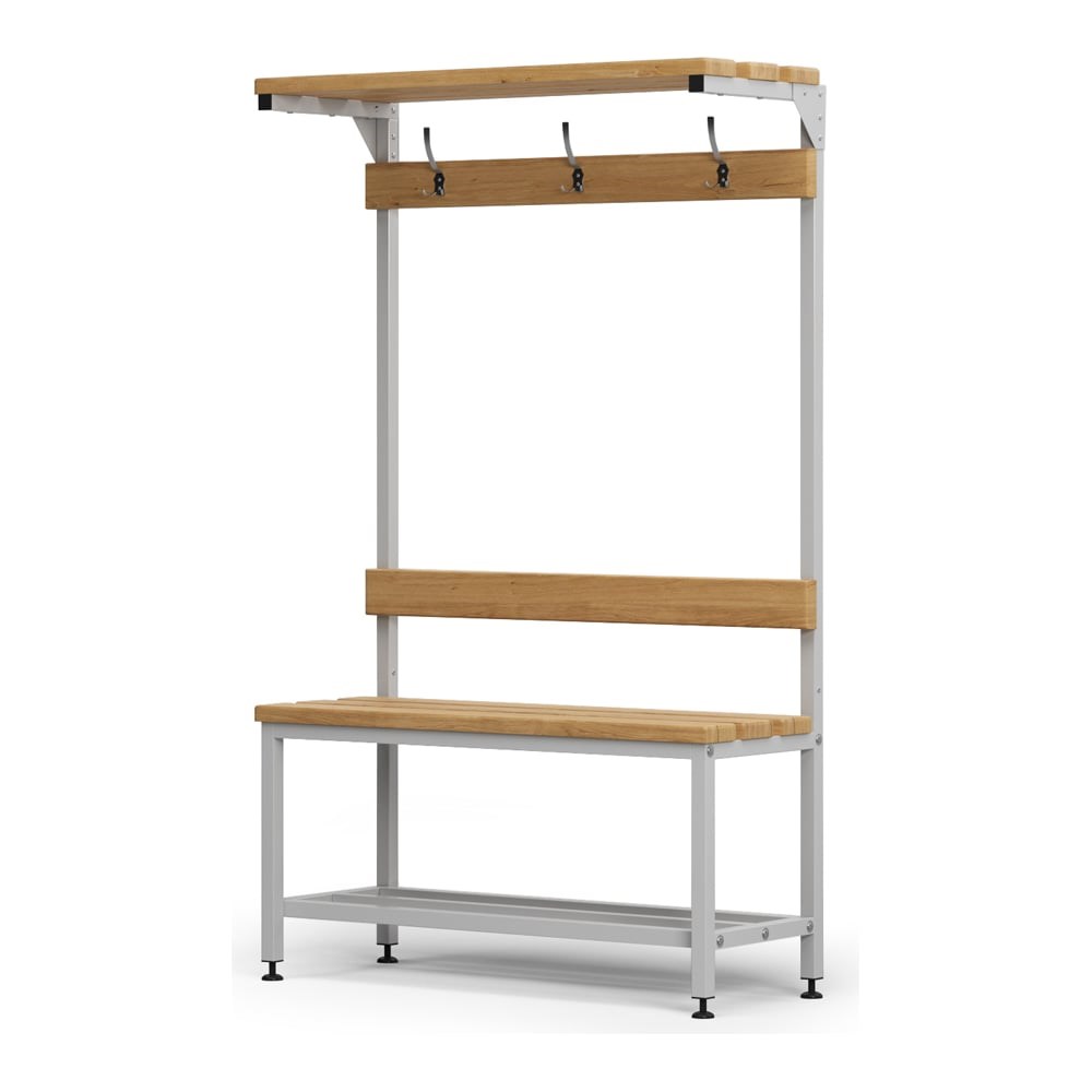 Очень прочная и долговечная скамейка для раздевалок со спинкой, вешалкой и полкой для шапок и подставкой под обувь внизу лавки. Все элементы отличаются надёжностью, скамьи практичны и неприхотливы в эксплуатации. Полимерное защитно-декоративное покрытие, особо прочное, коррозионно-стойкое, устойчиво к перепадам температуры. Сиденье скамьи — три массивные доски (древесина хвойных пород толщиной 30 мм), пропитанные антисептиком и покрытые водостойким лаком. Скамейка снабжена спинкой, вешалкой и верхней полкой, стойка к влаге, и большим нагрузкам, что обусловливает широкий диапазон условий её использования. Скамья — разборная, конструкционные элементы её скрепляются с помощью винтов и стяжек М6. На неровной поверхности скамья легко выставляется ровно благодаря возможности плавной регулировки ножек по высоте. Каркас — из крепкого стального прямоугольного профиля 30х30 мм. Окрашен порошковой краской RAL 7035.