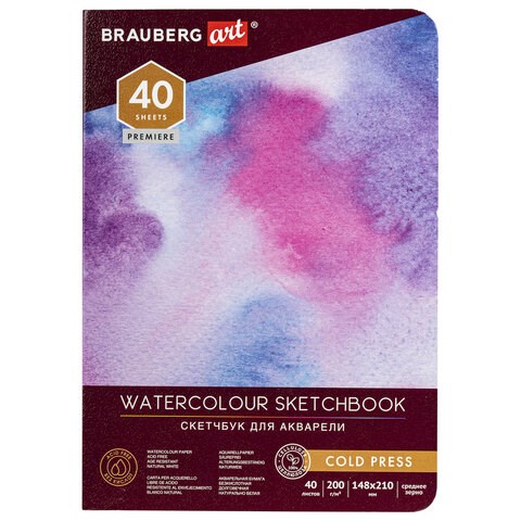 Скетчбук для акварели, 200 г/м2, 148х210 мм, среднее зерно, 40 л., книжный переплет, BRAUBERG ART PREMIERE, 113262