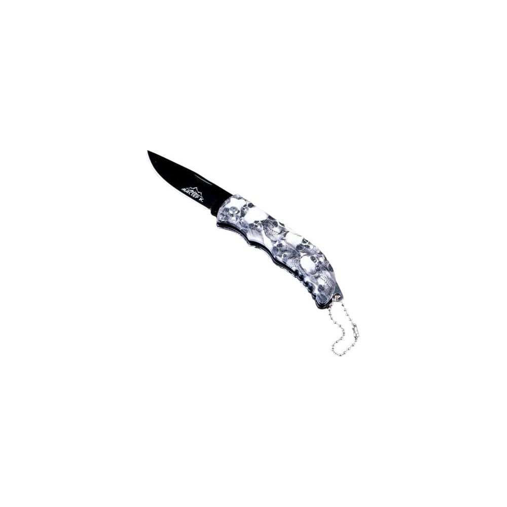 Перочинный складной нож Мастер К Черепа лезвие 6.6 см 4411910 подходит для использования в туристических поездках, походах, на рыбалке и охоте. Рабочая часть изготовлена из прочной хромированной стали, что обеспечивает долгий срок службы. Габариты ножа позволяют свободно переносить его с собой или закрепить в виде брелка.