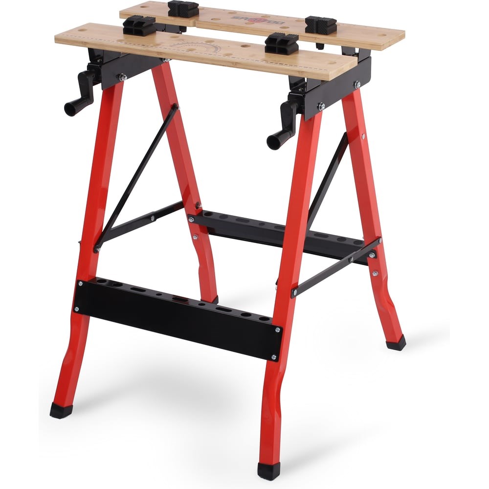 Складной верстак предназначен для зажима и крепления плоских деталей различной формы, а также заготовок цилиндрической формы для последующего распила, обработки поверхностей и торцов, а также сверления отверстий. Устойчивая станина с системой быстрого складывания для компактного хранения. Максимальная нагрузка – 100 кг.Рабочая поверхность панелей с высококонтрастной юстировочной шкалой, транспортиром и линейкой для удобства разметки заготовок.Удобная высота рабочего стола для комфортной работы с заготовками.Панели с упрочненной поверхностью произведены из бамбука.Станина с резиновыми противоскользящими опорами.Система пластиковых упоров специальной формы позволяет надежно зажимать плоские детали шириной до 235мм, плоские заготовки круглой формы диаметром до 380 мм, а также заготовки цилиндрической формы диаметром до 33,5мм.2 интегрированных отделения для хранения инструментов.Инструкция – внутри коробки.Размеры:Рабочее положение: 630мм х605мм х780ммСложенный: 630мм х220мм х1050мм.Вес – 6,5кг.Важно!!!Перед началом эксплуатации внимательно прочитайте инструкцию до конца.Храните верстак в сухом помещении.Регулярно очищайте механизм привода зажимной системы от грязи, пыли, опилок и отходов, возникающих при обработке деталей и заготовок.Смазывайте механизм привода консистентными смазками!ВНИМАНИЕ!!!Запрещено использовать станину и рабочую поверхность верстака в качестве лестницы!!!Запрещено вставать ногами или вставать на колени, а также садится на рабочую поверхность верстака!!!