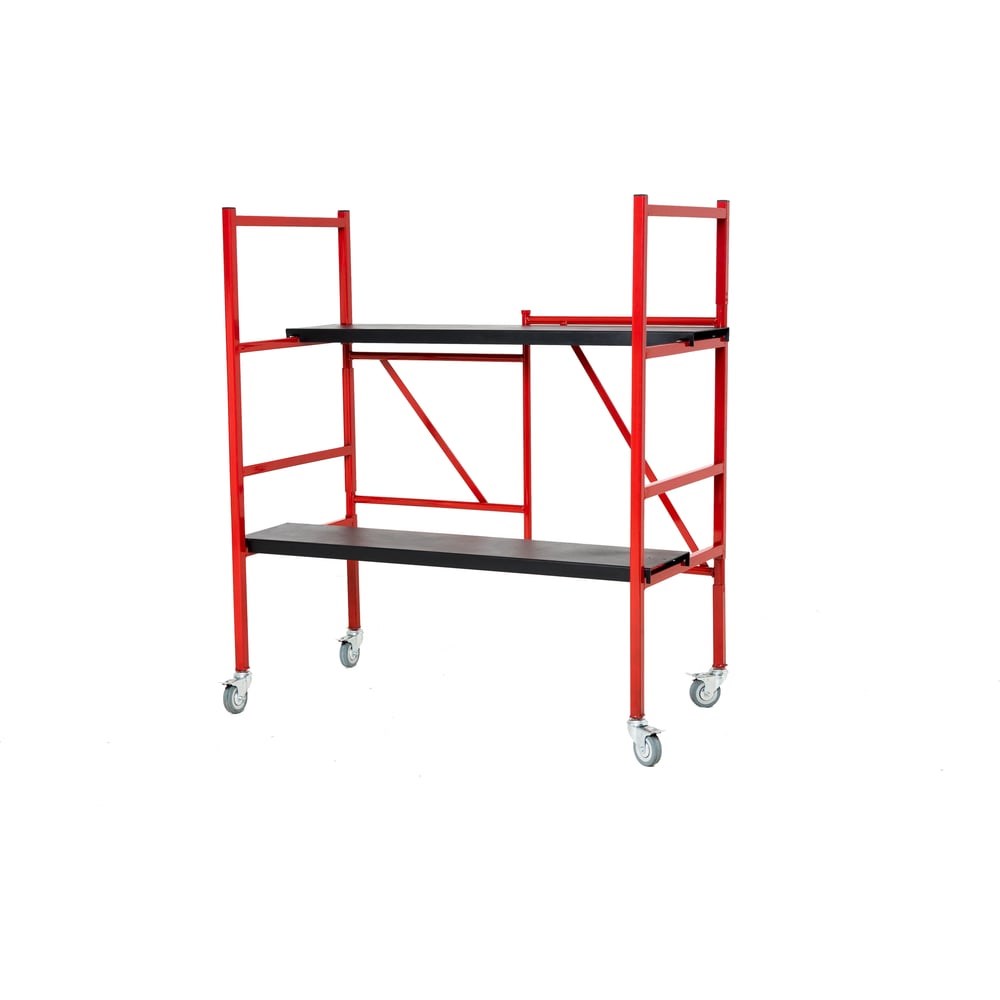 Складные леса представляют собой конструкцию, состоящую из раздвижной несущей рамы и двух независимых опор. Для приведения лесов в рабочее положение достаточно установить несущую раму и зафиксировать опоры (настилы) на необходимой высоте. После этого складные леса готовы к эксплуатации. Опоры (настилы) могут быть установлены на высоту 40, 60, 90 и 120 см. Конструкция выполнена из стали и при этом имеет достаточно легкий вес (менее 25 кг), что позволяет ее переносить одному человеку. Ширина конструкции (54 см) обеспечивает доступ в любой дверной проем. Для удобства перемещения лесов на ножках установлены транспортировочные колеса со стопорами. Внимание! Колеса предназначены исключительно для удобства перемещения лесов по объекту! Складные леса в основном предназначены для различного рода отделочных/демонтажных работ внутри жилых помещений. В рабочем положении длина всей конструкции составляет 1 метр, что позволяет мастеру разместиться на опоре вместе с инструментом. Габариты лесов в сложенном виде позволяют ее перевозку практически в любом легковом автомобиле.