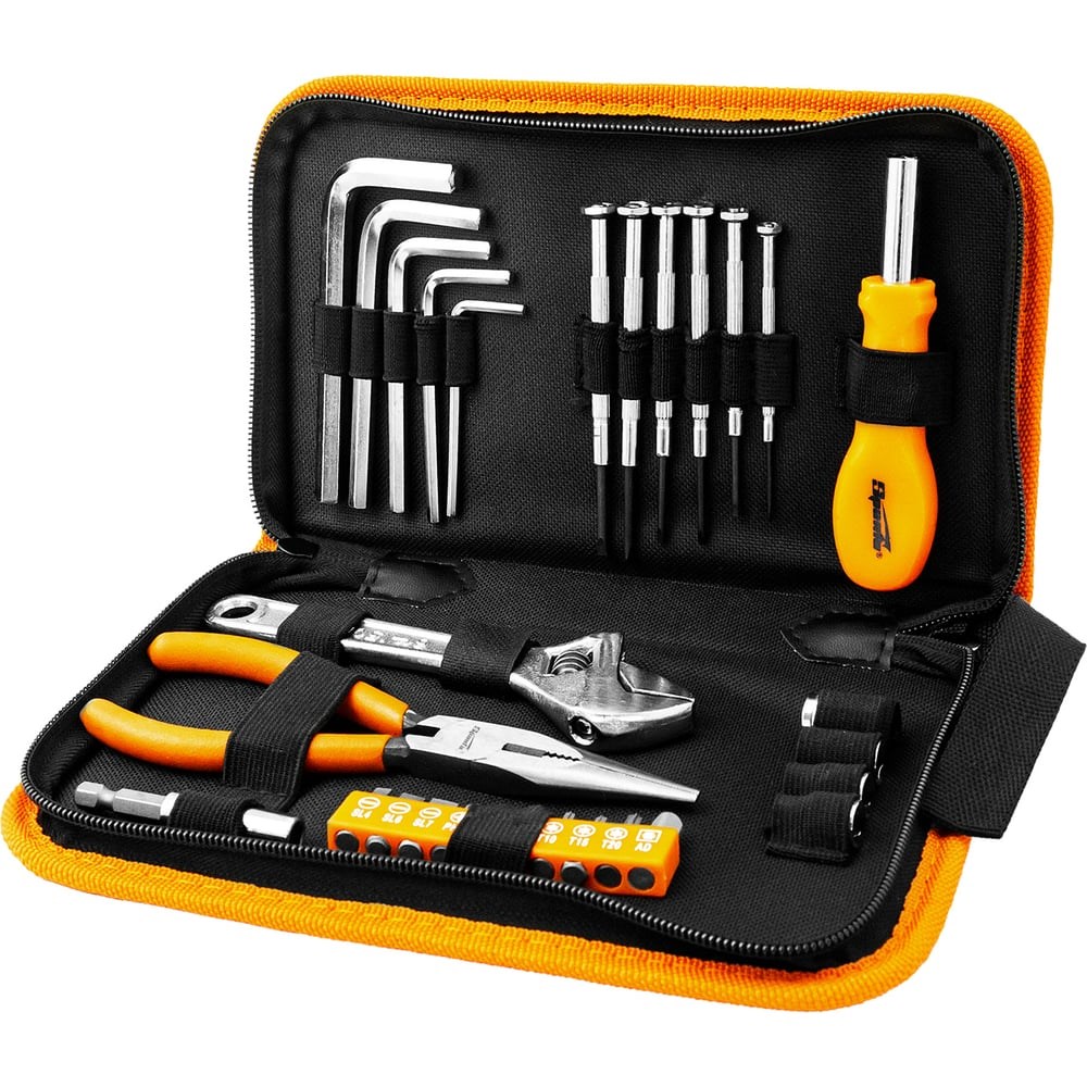 Набор Sparta 13535 состоит из 29 предметов, предназначенных для проведения слесарно-монтажных работ. Подходит для применения в бытовых условиях, в гараже и небольшой мастерской. Входящие в набор биты и торцевые головки, ключи-шестигранники, часовые отвертки, длинногубцы, переходник, удлинитель и разводной ключ позволяют работать с крепежом, имеющим стандартную и мелкую резьбу, в том числе в труднодоступных местах.